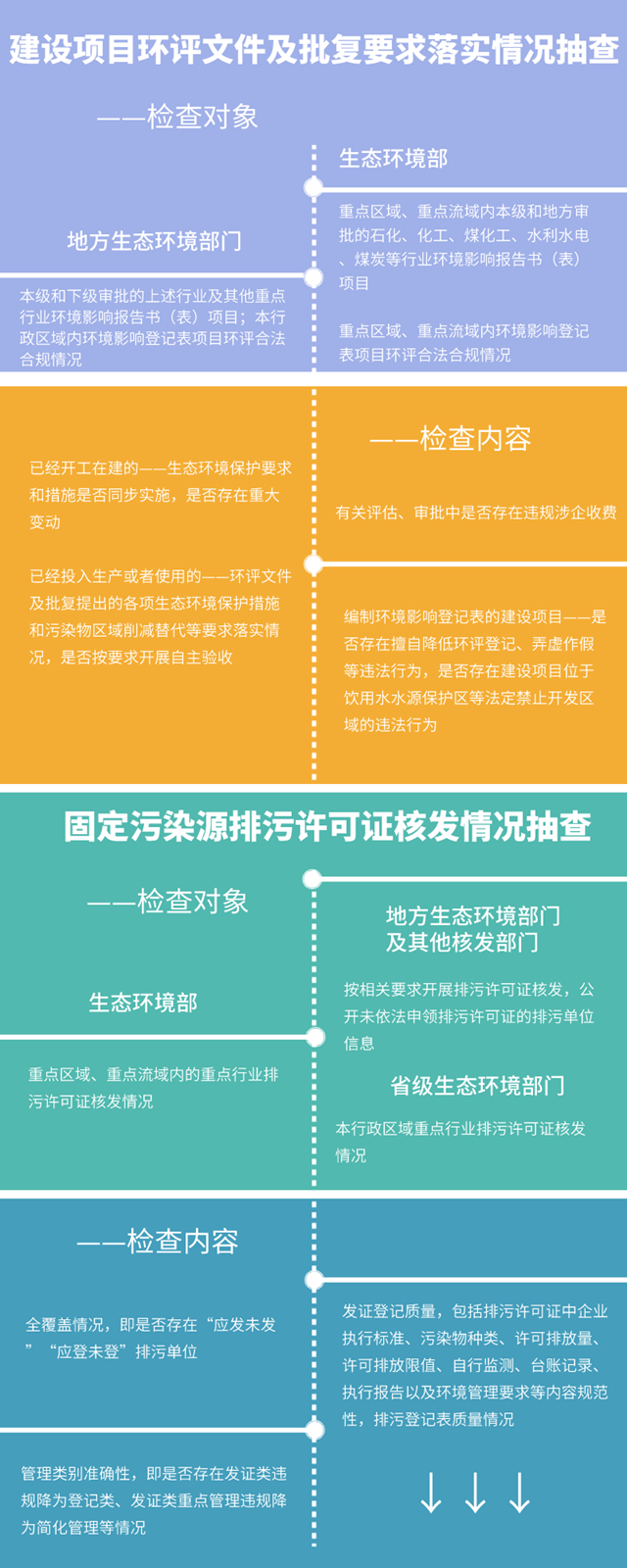 重點領域規(guī)劃環(huán)評落實情況抽查、建設項目環(huán)境影響報告書(表)復核、建設項目環(huán)評文件及批復要求落實情況抽查、固定污染源排污許可證核發(fā)情況抽查、固定污染源排污許可證執(zhí)行情況抽查