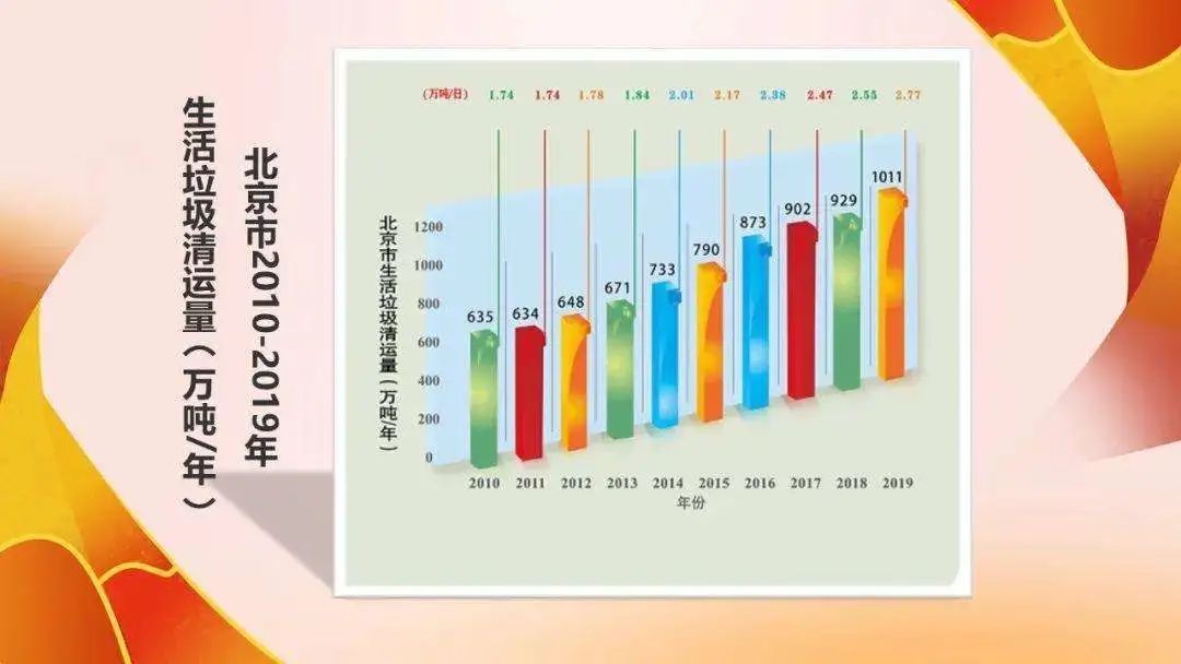 2011年后,也就是人口調(diào)控之后,趨勢開始變化,生活垃圾量轉(zhuǎn)為上升勢頭。2012年,垃圾達648.31萬噸,2013年672萬噸,到2018年,北京的垃圾產(chǎn)生量達到了901.8萬噸。