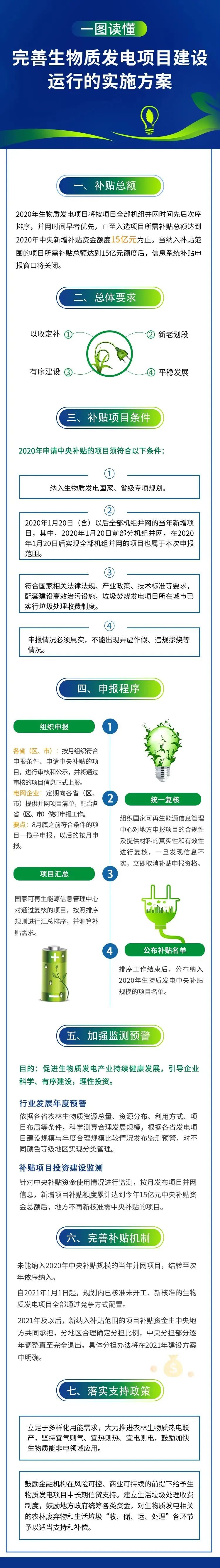 補貼總額:2020年生物質(zhì)發(fā)電新增項目中央年度補貼額度為15億元。申報條件。須納入國家及省級有關(guān)規(guī)劃;污染物排放達標;2020年1月20日(含)之后項目全部機組并網(wǎng)投運;若是垃圾焚燒發(fā)電,項目所在城市已實行垃圾處理收費制度;企業(yè)須自我信用承諾。對不誠信者將納入國家征信體系,將影響企業(yè)的投融資和日常經(jīng)營活動。如何申報。各省按月組織企業(yè)申報(2020年8月底之前符合條件的項目可一攬子申報)并負責初審;有關(guān)部門組織國家可再生能源信息中心對地方申報項目進行復(fù)核。對信息不實項目,直接取消補貼資格。