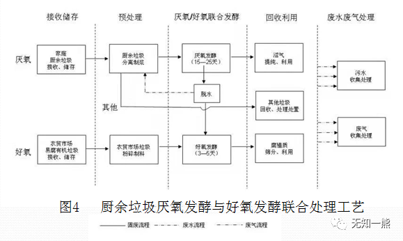 被動(dòng)方法是加強(qiáng)三廢處理。如對(duì)濕式發(fā)酵,沼液產(chǎn)量大,沼液產(chǎn)量可高達(dá)0.85倍以上廚余垃圾處理量,最好自配沼液處理設(shè)施,并加大中水回用以減少外加水量,且應(yīng)大力開(kāi)發(fā)應(yīng)用回流和流體攪拌技術(shù)及裝備以減少沼液處理量和處理難度。濕式發(fā)酵轉(zhuǎn)換的沼渣產(chǎn)量也較大,應(yīng)妥善處置。廚余垃圾接收、預(yù)處理和沼液、沼渣處理等工序工段的臭氣控制也非常重要,應(yīng)強(qiáng)化相關(guān)設(shè)備設(shè)施的密封和加大相關(guān)車(chē)間的換氣次數(shù)。沼渣可經(jīng)脫水處理后焚燒處置,也可采用厭氧發(fā)酵與好氧發(fā)酵聯(lián)合工藝,與農(nóng)貿(mào)市場(chǎng)廚余垃圾一起堆肥,其工藝流程見(jiàn)圖4。