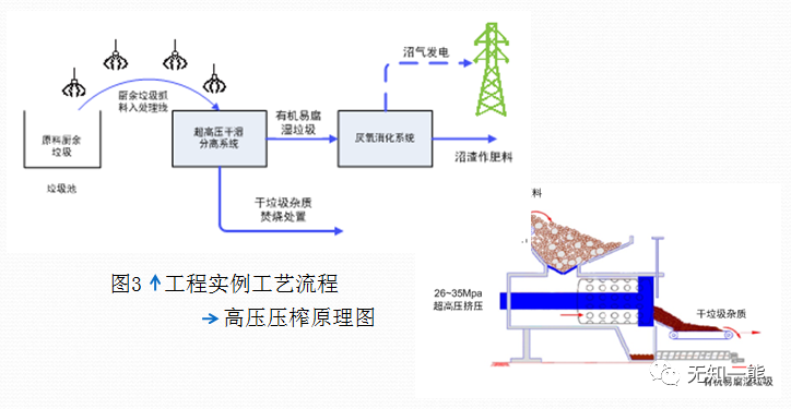 歐洲的高壓壓榨技術(shù)集破袋、破碎和擠壓制漿于一體,直接將廚余垃圾分離成干、濕組分(含水率分別為30%和70%左右),且允許廚余垃圾的雜質(zhì)含量高達(dá)30%,極大地縮短了預(yù)處理流程。干組分與其他垃圾混合,或直接焚燒回收熱能,或深加工成水泥窯用燃料;濕組分則通過(guò)厭氧發(fā)酵制取沼氣或堆肥。廣州福山生物質(zhì)廠已經(jīng)成功應(yīng)用,其工藝流程和高壓壓榨原理見(jiàn)圖3,建議推廣應(yīng)用。