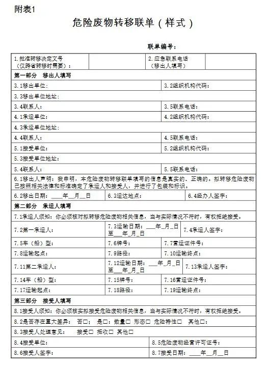 第十三條【轉(zhuǎn)移聯(lián)單】危險廢物轉(zhuǎn)移聯(lián)單相關(guān)信息應(yīng)與信息系統(tǒng)危險廢物管理計劃中危險廢物產(chǎn)生、貯存、轉(zhuǎn)移、利用、處置等備案信息關(guān)聯(lián)并一致。危險廢物轉(zhuǎn)移聯(lián)單格式見附表1。因特殊原因無法運行危險廢物轉(zhuǎn)移電子聯(lián)單時,可先使用紙質(zhì)聯(lián)單,并于紙質(zhì)聯(lián)單辦結(jié)5個工作日內(nèi)在信息系統(tǒng)中補錄電子聯(lián)單。除另有規(guī)定外,禁止運輸和接受無危險廢物轉(zhuǎn)移聯(lián)單的危險廢物。