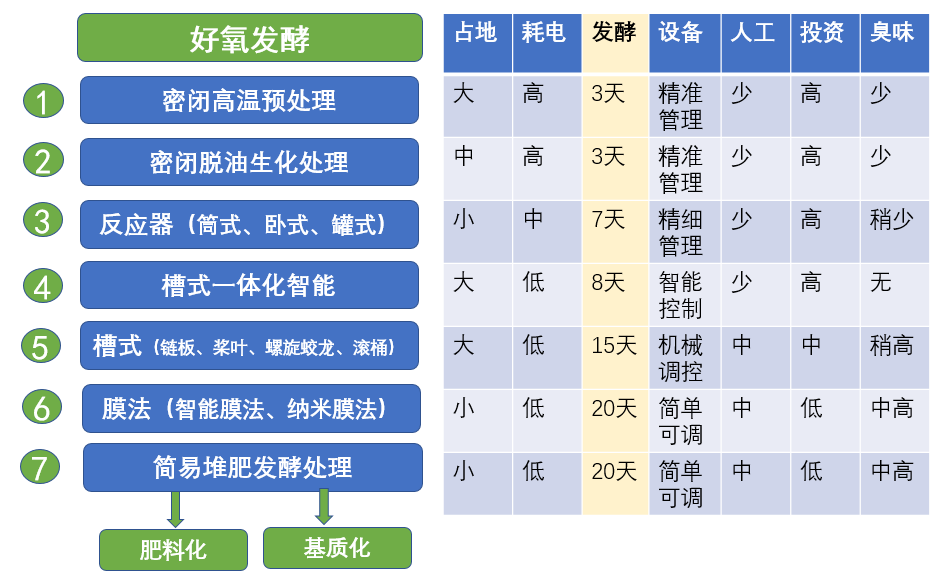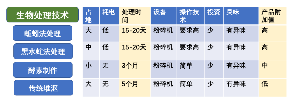 各種生物法處理技術(shù)有其不同的特點,通過比較處理廢棄物占地多少、處理噸成本耗電、發(fā)酵時間長短、處理操作難易與投資高低、人工投入多少、處理過程對環(huán)境產(chǎn)生的臭味異味多少、產(chǎn)品附加值高低,來了解不同處理技術(shù)的優(yōu)點和不足。