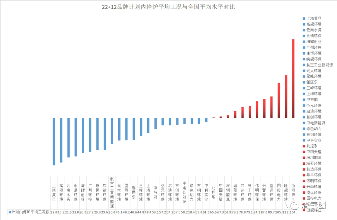 如果將這些22+12=34家品牌混合評定,研究團(tuán)隊發(fā)現(xiàn)。計劃內(nèi)停爐次數(shù),低于全國平均水平,排名前五低的品牌,分別為,上海復(fù)旦、高能環(huán)境、云南水務(wù)、永清環(huán)保、海螺創(chuàng)業(yè),其中有四家是“跨界”品牌。計劃外停爐次數(shù),低于全國水平的,排名前五低的企業(yè),分別為,永清環(huán)保、興蓉環(huán)境、粵豐環(huán)保、高能環(huán)境、首鋼環(huán)境。依然有四家是“跨界”品牌。故障天次,低于全國水平,排名前五低的企業(yè),分別為,皖能環(huán)保、首創(chuàng)環(huán)境、高能環(huán)境、上海復(fù)旦、海螺創(chuàng)業(yè)。其中有兩家為“跨界”品牌。綜合來看,高能環(huán)境、永清環(huán)保和上海復(fù)旦、興蓉環(huán)境等四家“跨界”品牌,在工況指標(biāo)上,比較資深品牌毫不遜色,甚至部分指標(biāo)略有領(lǐng)先。雅居樂、盈峰環(huán)境、云南水務(wù)、中科實業(yè)等四家品牌,表現(xiàn)相對中規(guī)中矩,與資深品牌持平。研究團(tuán)隊希望上述品牌能夠繼續(xù)保持較良好的運維水平,也希望排名靠后的品牌,能夠認(rèn)真重視自身存在的問題,努力改進(jìn)運維思路,提升運營水平。