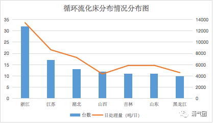 - 共有21個(gè)省份擁有一個(gè)以上的循環(huán)流化床項(xiàng)目,其中臺(tái)數(shù)最多,處理量最大的三個(gè)省份,分別為浙江、江蘇和湖北。