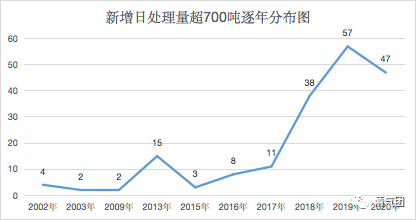值得一提的是,800噸+循化流化床鍋爐,國內(nèi)擁有三臺(tái),分別集中在浙能錦江武漢、淄博,以及嘉興康恒的嘉興項(xiàng)目。研究團(tuán)隊(duì)還發(fā)現(xiàn),從2000年至今,二十多年的歷史里,循環(huán)流化床的每年投入運(yùn)營臺(tái)數(shù),均未能超過20臺(tái),最高記錄在2015年,當(dāng)年有17臺(tái)循化流化床投入正式運(yùn)營。大型焚燒爐和小型焚燒爐,需求旺盛,中間級(jí)焚燒爐需求持平。- 研究團(tuán)隊(duì)發(fā)現(xiàn),700噸+的大型焚燒爐,在2018年之后,投入運(yùn)營的臺(tái)數(shù),快速增長,2019年達(dá)到歷史投運(yùn)臺(tái)數(shù)記錄,57臺(tái)。