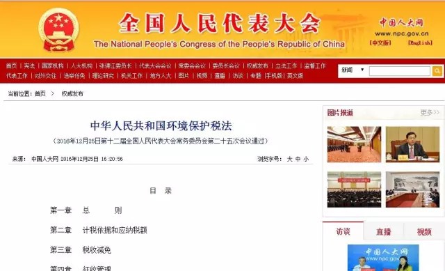 2016年12月25日,曾走過6年立法之路、歷經(jīng)兩次審議的《中華人民共和國環(huán)境保護稅法》終于由第十二屆全國人民代表大會常務委員會第二十五次會議通過。習近平簽發(fā)中華人民共和國第六十一號主席令予以公布,新法自2018年1月1日起施行。