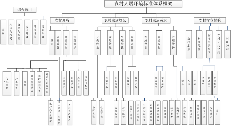 根據(jù)農(nóng)村人居環(huán)境發(fā)展現(xiàn)狀和實(shí)際需求,構(gòu)建內(nèi)容科學(xué)、結(jié)構(gòu)合理的農(nóng)村人居環(huán)境標(biāo)準(zhǔn)體系框架。體系分為三個(gè)層級,第一層級包括綜合通用、農(nóng)村廁所、農(nóng)村生活垃圾、農(nóng)村生活污水、農(nóng)村村容村貌標(biāo)準(zhǔn)子體系。第二層級由第一層級展開,包括6個(gè)綜合通用要素、4個(gè)農(nóng)村廁所要素、4個(gè)農(nóng)村生活垃圾要素、3個(gè)農(nóng)村生活污水要素、5個(gè)農(nóng)村村容村貌要素。第三層級由第二層級展開,對相應(yīng)標(biāo)準(zhǔn)要素作出進(jìn)一步細(xì)化分類(如圖所示)。
