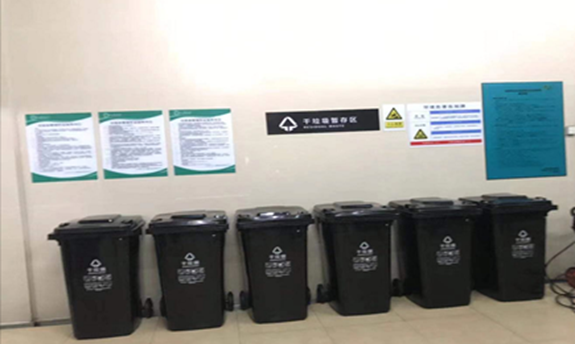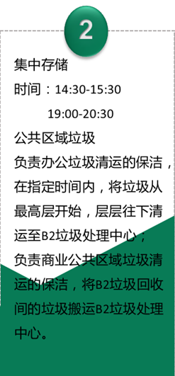 樓層公共區(qū)域的保潔工作人員負(fù)責(zé)垃圾初步分類,分類垃圾桶內(nèi)的垃圾袋按顏色區(qū)分,在垃圾分好類并用袋裝密封后,將由專人從上至下層層收集并運(yùn)輸,減少貨梯使用時(shí)間,提高垃圾運(yùn)輸效率。