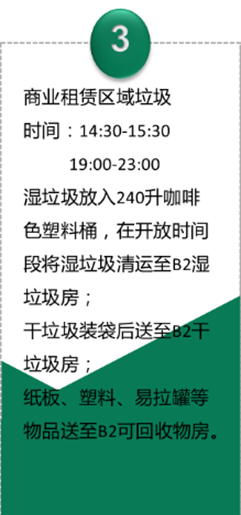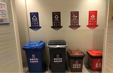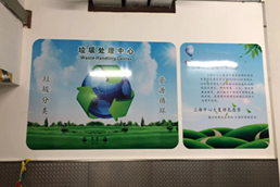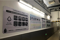 上海中心大廈對(duì)B2垃圾房(地下2層)進(jìn)行改造,改造后的垃圾房針對(duì)不同垃圾進(jìn)行分區(qū)管理,并添加了垃圾分類相關(guān)的宣傳海報(bào)及公示欄。結(jié)合BOMA(中國)標(biāo)準(zhǔn)將管理文件、警示標(biāo)志,以及清潔消毒藥劑MSDS張貼上墻,引導(dǎo)白領(lǐng)、租戶正確投放垃圾。