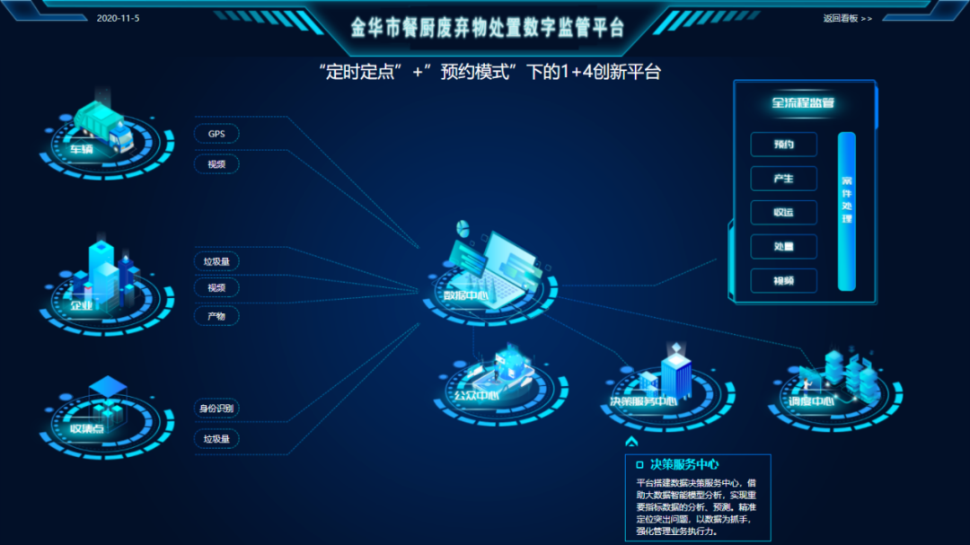 在政府監(jiān)管層面,依托餐廚垃圾信息化管理平臺(tái),把產(chǎn)生點(diǎn)、收運(yùn)單位、收運(yùn)車輛、處置終端通過技術(shù)手段進(jìn)行智能聯(lián)網(wǎng),形成餐廚垃圾智能監(jiān)控網(wǎng)絡(luò),及時(shí)發(fā)現(xiàn)并快速處理餐廚垃圾物收運(yùn)處置過程中違規(guī)行為;通過成熟的信息技術(shù)手段,構(gòu)建大數(shù)據(jù)智能分析模型,使餐廚垃圾管理實(shí)現(xiàn)全程科學(xué)化監(jiān)控及實(shí)時(shí)管理,輔助分析決策。