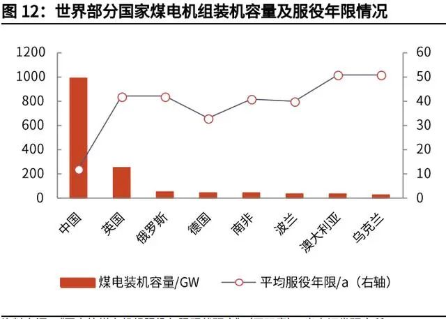 煤電資產(chǎn)擱淺的問題,表明了轉(zhuǎn)型需經(jīng)歷陣痛。一方面,從能源結(jié)構(gòu)和自身稟賦 來看,我國(guó)的能源消耗以煤為主,煤電發(fā)電量在 2019 年占總發(fā)電量的 65%,遠(yuǎn) 超發(fā)達(dá)國(guó)家;另一方面,我國(guó)煤電機(jī)組的平均服役年限僅 12 年,而發(fā)達(dá)國(guó)家普 遍達(dá)到 40 年以上。更快的碳排放量下降斜率,意味著將會(huì)有大量的未達(dá)到退役 年限的煤電資產(chǎn)提前“擱淺”。