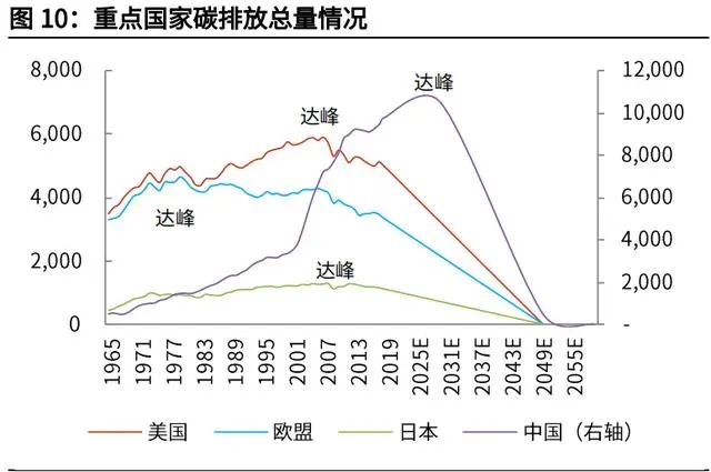 我國(guó)碳排放下降斜率更大。由于發(fā)展階段的不同,發(fā)達(dá)國(guó)家已普遍經(jīng)歷“碳達(dá)峰”, 為達(dá)到 2050 年“碳中和”,更大程度上只是延續(xù)以往的減排斜率。而我國(guó)碳排 放總量仍在增加,需要經(jīng)歷 2030 年前“碳達(dá)峰”,然后走向 2060 年前“碳中 和”。從實(shí)現(xiàn)“碳中和”的年限來看,比發(fā)達(dá)國(guó)家時(shí)間更緊迫,碳排放下降的斜 率更大。