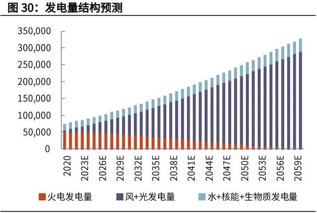根據(jù)我們的上述假設(shè),以 2019 年發(fā)電量 7.22 萬億千瓦時(shí)為基礎(chǔ),2030 年發(fā)電 量達(dá)到 11.9 萬億千瓦時(shí)(和部分機(jī)構(gòu)的預(yù)測(cè)數(shù)據(jù)基本一致),2060 年發(fā)電量進(jìn)一步達(dá)到 32.71 萬億千瓦時(shí)。