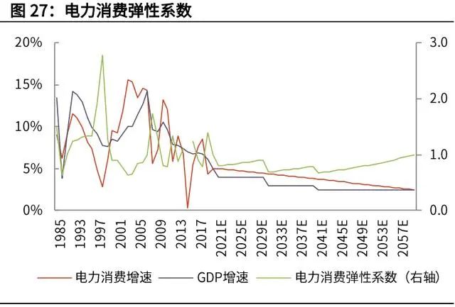 (1)我們采用“自上而下”的測(cè)算方法,假設(shè)未來 GDP 增速和發(fā)電量增速?gòu)摹笆?三五”末期的 5%逐步下降到 2.5%;而由于節(jié)能降耗的原因,未來單位 GDP 能 耗逐步下降,電力消費(fèi)彈性系數(shù)將小于 1。
