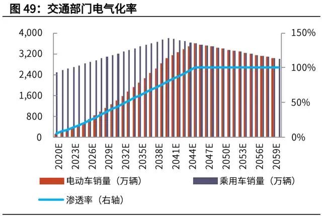我們預(yù)計(jì),乘用車銷量在 2040 年見頂,電動(dòng)車的滲透率在 2045 年達(dá)到 100%, 則電動(dòng)車的銷量將在 2045 年達(dá)到 3600 萬輛/年。假設(shè)單車售價(jià)保持下行趨勢(shì), 在 2060 年達(dá)到 12 萬元/輛左右。則電動(dòng)車領(lǐng)域累計(jì)將帶來 130 萬億人民幣的累 計(jì)新增投資。