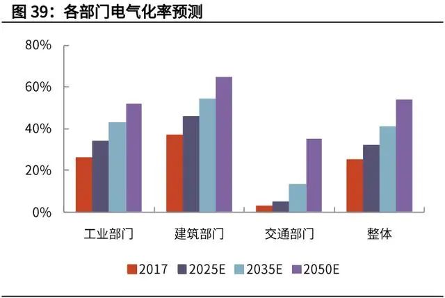 由于能源供給側(cè)向綠色電力轉(zhuǎn)變,所以需求側(cè)的脫碳首先意味著終端電氣化。根據(jù)國(guó)網(wǎng)能源研究院 2019 年 12 月的研究成果,終端電氣化率在 2050 年達(dá)到 50%以上,其中工業(yè)、建筑、交通部門分別達(dá)到 52%、65%、35%。
