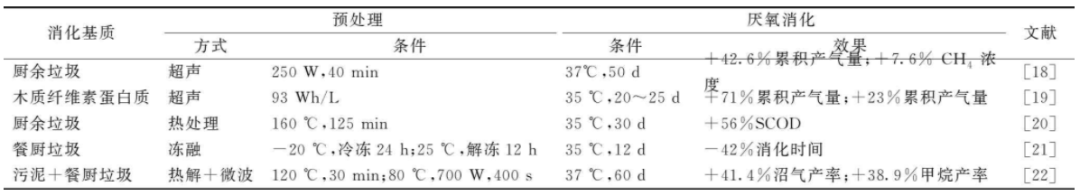 物理預(yù)處理方法包含超聲波、熱處理、凍融和微波處理等手段,相關(guān)研究見表1。超聲波的空化作用和水分子凍結(jié)的冰晶產(chǎn)生的機(jī)械作用使細(xì)胞壁破解,破壞細(xì)胞膜結(jié)構(gòu),使細(xì)胞內(nèi)有機(jī)物質(zhì)更多溶出,與水解酶充分接觸,增大水解效率,縮短消化時間。微波預(yù)處理與熱處理機(jī)理相似,利用電磁場的熱效應(yīng)加熱破壞細(xì)胞有機(jī)質(zhì)結(jié)構(gòu),但與傳統(tǒng)的熱處理方法相比,微波預(yù)處理加熱速度快、熱效率高、設(shè)備體積小??紤]處理效果的同時,預(yù)處理成本與額外獲取的能源也是應(yīng)該重視的問題。額外獲得能源和預(yù)處理投入相抵后,凍融預(yù)處理因無須添加化學(xué)藥品與低能量輸入,是具最高利潤(10~15歐元/(t·kW))的預(yù)處理方法。近年來,水熱預(yù)處理逐漸成為研究熱點,具有更大的發(fā)展前景。水熱預(yù)處理不僅受溫度和停留時間的影響,還與壓力有關(guān)。由于水蒸氣容易獲得,很多工業(yè)生產(chǎn)過程都可能產(chǎn)生大量的水蒸氣且無法合理利用,所以水熱預(yù)處理的成本更低,并且能實現(xiàn)能量的循環(huán)。此外,荷蘭Sustec公司研發(fā)出的TurboTec熱水解工藝為連續(xù)流熱水解工藝,可將污泥熱水解后通過熱轉(zhuǎn)換器回收熱能,使熱水解預(yù)處理的熱能回收利用成為可能?,F(xiàn)有能源的利用和能量回收系統(tǒng)的研究,是實現(xiàn)處理效果與經(jīng)濟(jì)效益共贏的重要發(fā)展方向。表1 廚余垃圾物理預(yù)處理厭氧消化的相關(guān)研究