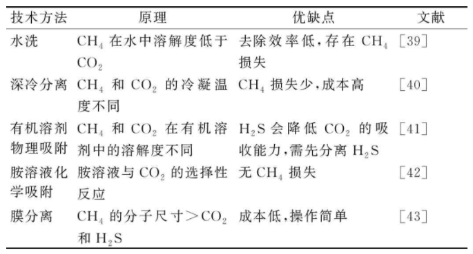 廚余垃圾厭氧消化的產(chǎn)物沼氣成分復(fù)雜,包括CH4、CO2、N2、H2S和硅氧烷等。其中:1)CO2含量越高,沼氣中的熱值越低;2)除甲烷外,沼氣中其他氣體是沼氣污染物。H2S和NH3具有極強(qiáng)的腐蝕性,燃燒后產(chǎn)生的SO2會破壞熱電聯(lián)產(chǎn)裝置和金屬部件。而硅氧烷,即使?jié)舛群苄。紵螽a(chǎn)生的硅膠類氧化物能殘留沉積在燃燒設(shè)備的引擎和閥門上造成故障。這些原因都會導(dǎo)致厭氧消化產(chǎn)生的沼氣不能直接利用,因此需要通過物理化學(xué)技術(shù)、生物技術(shù)等對產(chǎn)生的沼氣進(jìn)行凈化和升級,以提高熱值,將其轉(zhuǎn)化為更高標(biāo)準(zhǔn)的燃料能源。常規(guī)的沼氣凈化升級方法總結(jié)見表2。