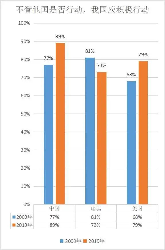 中國(guó)受訪者對(duì)我國(guó)應(yīng)該積極擔(dān)負(fù)起全球氣候變化和環(huán)境治理的領(lǐng)導(dǎo)責(zé)任,有了更高的支持和信心,且支持度遠(yuǎn)高于美國(guó)和瑞典。