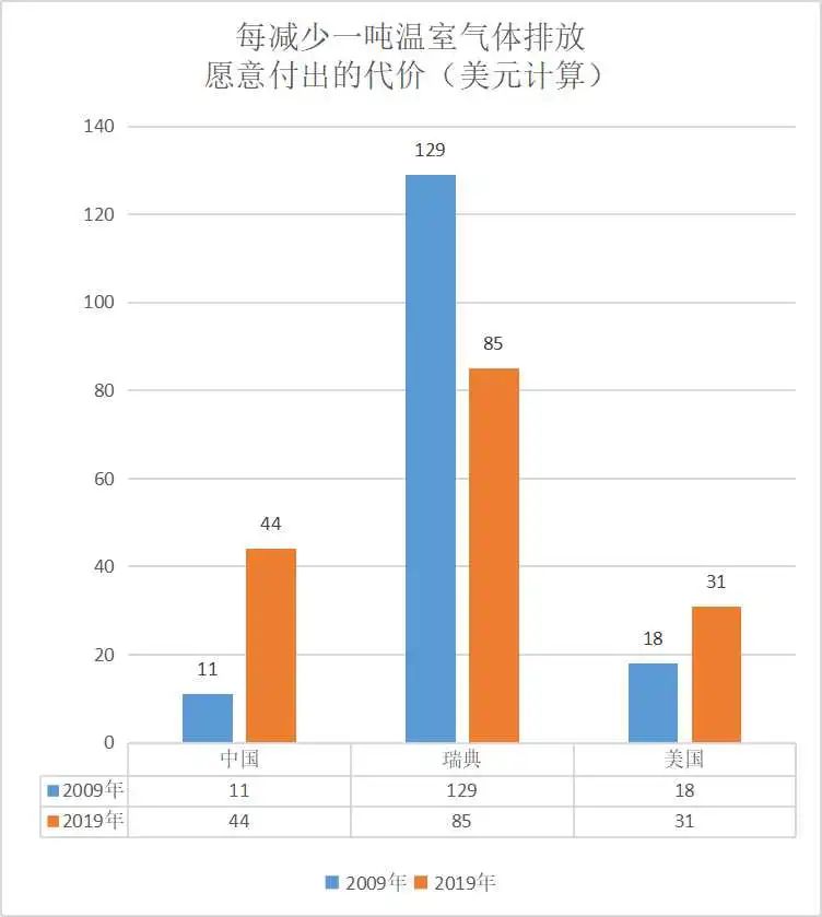這種圖表中,雖然瑞典受訪者的支付意愿金額,依然是三國(guó)最高,但卻比十年前下降了34%,表現(xiàn)出其減排信心的衰弱。