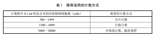 根據(jù) 8.3.1 調(diào)整后的浮游植物的密度,選用合適的計數(shù)方式,使測定過程中浮游植物細(xì)胞的總計數(shù)量為 500 個——1500 個。表1為推薦選用的計數(shù)方式。