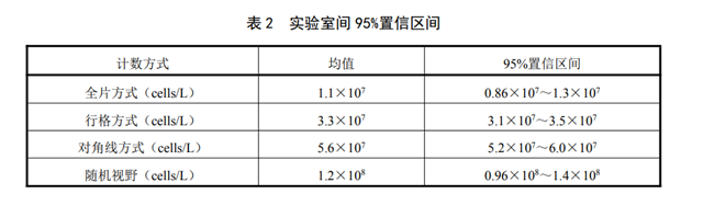 6家實驗室分別用全片計數(shù)、行格計數(shù)、對角線計數(shù)和隨機視野計數(shù)對浮游植物密度為1×107 cells/L、3×107 cells/L、5×107 cells/L、1×108 cells/L 的實際樣品進行了7次重復(fù)測定,實驗室內(nèi)的相對標(biāo)準(zhǔn)偏差分別為2.4%——11%,2.9%——10%,2.7%——11%,4.8%——8.2%;實驗室間相對標(biāo)準(zhǔn)偏差分別為22%、5.6%、7.1%、21%。計算測定結(jié)果對數(shù)值的 95%置信區(qū)間,再取反對數(shù)得到的實驗室間95%置信區(qū)間見表2。