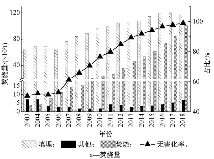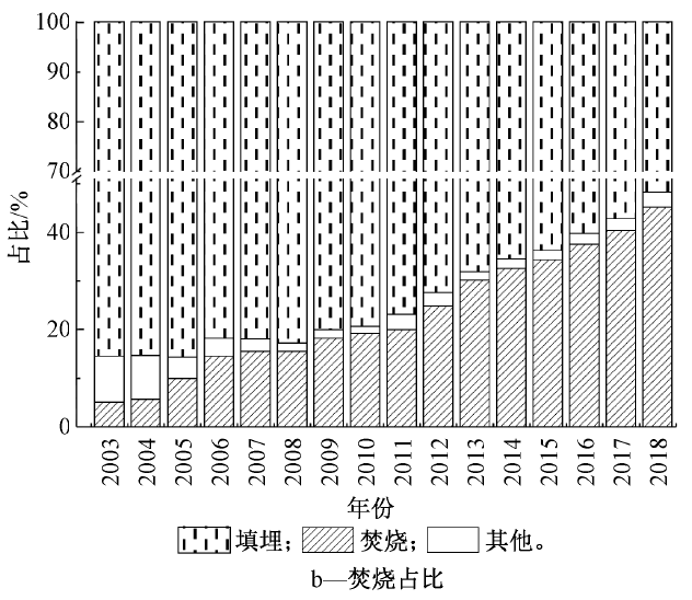 2)焚燒量的發(fā)展:隨著垃圾焚燒廠的建設(shè),我國垃圾無害化處置能力和處置量不斷提高。2003年我國垃圾無害化量為0.75億t,無害化率為50.4%,到2018年垃圾無害化量達(dá)到2.26億t,處理率達(dá)到99%(圖2a)。垃圾年焚燒量從2003年的370萬t發(fā)展到2018年的1.02億t(圖2a)。垃圾焚燒量占無害化處理總量的比例從2003年的4.9%發(fā)展到2018年的45.1%。而且根據(jù)行業(yè)估計(jì)到2020年超過50%(圖2b)。據(jù)此,我國將很快進(jìn)入“焚燒為主,填埋托底”的垃圾終端處理格局。