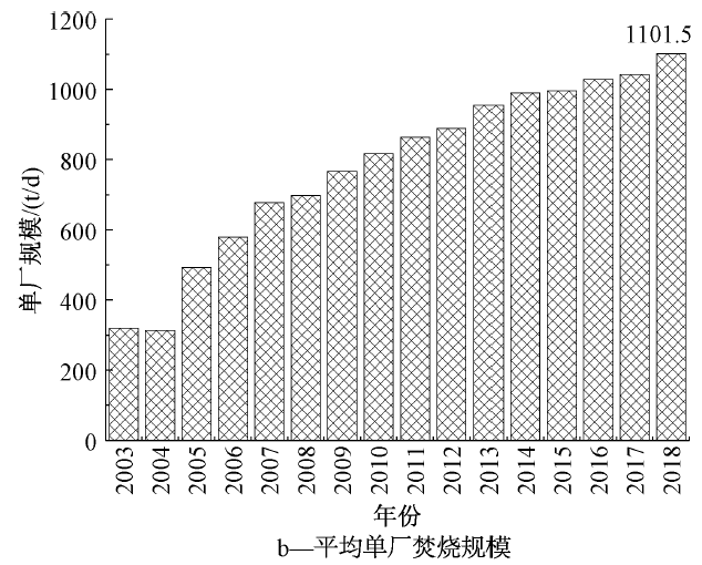 1)焚燒廠建設(shè):中國垃圾焚燒發(fā)電應(yīng)用始于1989年的深圳,全國垃圾焚燒廠從2003年的47家發(fā)展到2018年底已建成投入運(yùn)行331座,處置規(guī)模達(dá)到36.36萬t/d(合1.33億t/a),見圖1a。另根據(jù)蕪湖生態(tài)中心調(diào)研,2019年4月底有428家垃圾焚燒發(fā)電廠投入運(yùn)行,并且216家正在建設(shè)。平均單廠處理規(guī)模也不斷上升,從2003年的319 t/d發(fā)展到2018年的1101 t/d,見圖1b;同時單廠最大規(guī)模不斷提高,其中上海于2019年建成6000 t/d的老港再生能源利用中心。