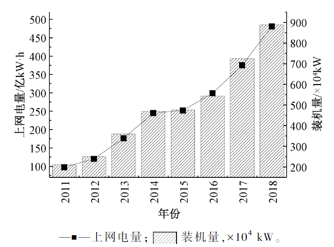 3)焚燒廠實(shí)際運(yùn)行:由于垃圾焚燒廠存在檢修維護(hù)以及部分區(qū)域超前建設(shè)等原因,建設(shè)安裝規(guī)模不等于實(shí)際處理能力。根據(jù)建設(shè)規(guī)模和實(shí)際焚燒量的統(tǒng)計(jì)數(shù)據(jù),折算得到垃圾焚燒廠能力利用率。由圖3可看出:處理能力利用率存在波動,最高出現(xiàn)在2007年(0.88)。將焚燒量折算到滿負(fù)荷運(yùn)行的小時數(shù),2007年為7708 h,2018年為6704 h,近10年來年運(yùn)行平均時數(shù)均未達(dá)到7200 h。運(yùn)行小時數(shù)也會直接影響發(fā)電量。根據(jù)中電聯(lián)網(wǎng)站信息,垃圾焚燒廠2011年聯(lián)網(wǎng)裝機(jī)量為209.7萬kW,上網(wǎng)電量為97.23億kW·h,到2018年聯(lián)網(wǎng)裝機(jī)量達(dá)到889萬kW,上網(wǎng)電量為481億kW·h,折合節(jié)約標(biāo)煤1480萬t(圖4)。入廠垃圾發(fā)電量為300~400 kW·h/t,熱發(fā)電效率為25%~30%。同時由于各廠技術(shù)、運(yùn)行水平及廠區(qū)建設(shè)差異,廠內(nèi)用電占比為15%~20%,因此上網(wǎng)電量水平為255~340 kW·h/t。根據(jù)浙江省發(fā)改委公布數(shù)據(jù)統(tǒng)計(jì),浙江省內(nèi)垃圾焚燒廠平均上網(wǎng)發(fā)電量287 kW·h/t。國家發(fā)展改革委《關(guān)于完善垃圾焚燒發(fā)電價(jià)格政策的通知》規(guī)定,生活垃圾焚燒廠生活垃圾折算上網(wǎng)電量暫定為280 kW·h/t,并按照該限值進(jìn)行分類補(bǔ)貼。