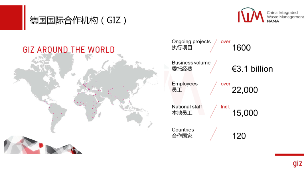 首先介紹一下德國國際合作機構(gòu),它其實算是德國的國企,唯一的股東是德國的經(jīng)合部,但是它是一個非盈利的企業(yè),我們所有的經(jīng)費都來自于德國的政府以及歐洲的政府基金會。我們在全球有120多個辦事處,有兩萬多個員工,1980年進入中國,目前有40多年的時間了。在中國有160個人,有100多位是中國同事,有60位是外國同事。
