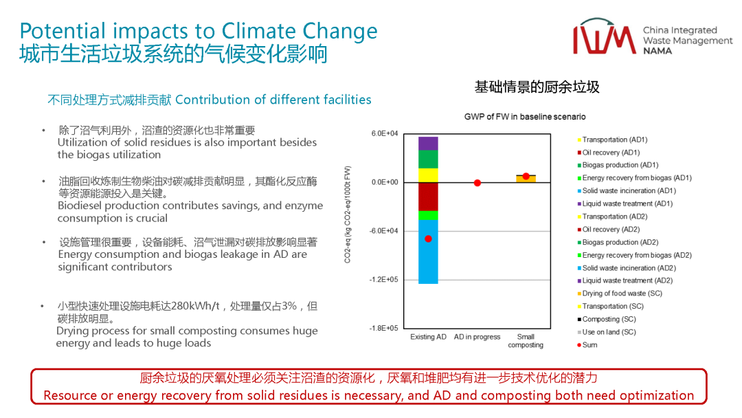 除了這個之外,我們也對不同的技術(shù)它的排放強度做了一個分析。比如剛剛說了,未來垃圾分類要開始了,有些垃圾都要被分出來了,都要處理,不同的處理技術(shù)它的減排貢獻是什么樣的,不同的技術(shù)處理有不同的技術(shù)路線,我們會分析堆肥,厭氧技術(shù),我們可以看到這個就是用了經(jīng)典的全生命周期的分析方法,我們委托丹麥科技大學(xué),是丹麥科技大學(xué)他們自行研發(fā)的一個分析工具,這個在垃圾領(lǐng)域是非常有名的,也得到了全球的認(rèn)可。在這個里面我們會去分析它不同的處理環(huán)節(jié)對減排的貢獻,可以看到有機垃圾絕對是非常減排的,但是減排的前提是在于我除了要把沼氣用好之外,沼渣的資源化也非常重要。如果我的有機垃圾處理完了之后,沼渣要么實現(xiàn)土地利用,替代一部分的有機肥,或者回到土地去做碳匯,哪怕從純減排的角度,重新回到焚燒廠焚燒,實現(xiàn)資源的回收,這兩部分都可以貢獻比較明顯的減排量。但是沼渣處理之后回到填埋場,從整個流程來講,減排的效益沒有那么明顯,可能會導(dǎo)致一部分負(fù)面的影響。同時油脂的回收,去做生物柴油,這個對減排的貢獻是非常明顯的。