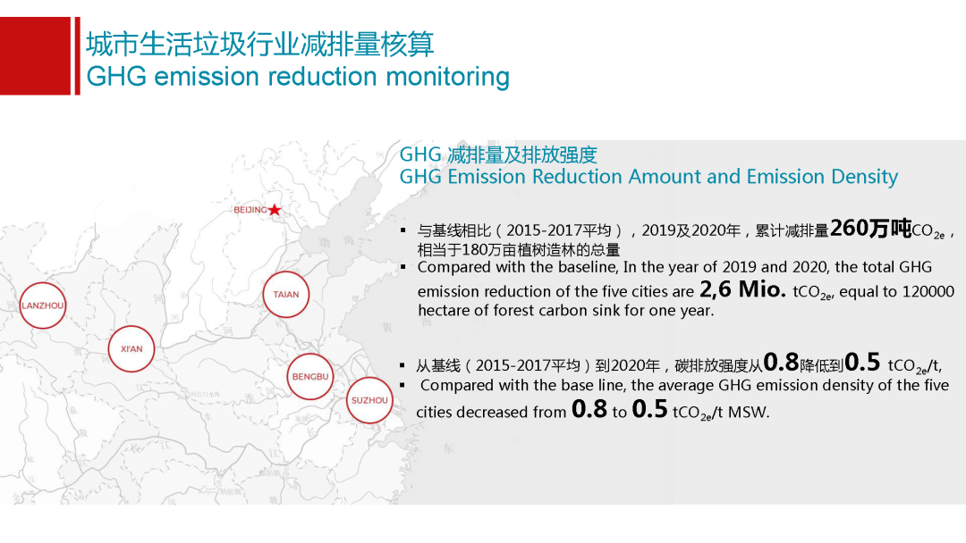 這里面也得到了試點城市特別主動的支持,在西安他們新建的焚燒廠配備了設(shè)備,這給我們國家的焚燒企業(yè)將來在這個行業(yè)里面他們的氧化亞氮的排放情況怎么樣,能夠提供第一手的數(shù)據(jù)。在這個基礎(chǔ)模型的處置上,我們有了幾個基線選擇,選擇了2015到17年三年的平均值,作為我們整個項目的基線。在這之后,2019年和2020年我們兩年分別去這五個城市做了監(jiān)測,可以看出有一些初步的結(jié)論。第一關(guān)于減排量和排放強度,這兩年從19年和20年,與基線相比,五個城市累計實現(xiàn)減排量260萬噸二氧化碳當(dāng)量,這個相當(dāng)于是180萬畝植樹造林,一年的碳匯地量,也是非??捎^的數(shù)據(jù)。除了排放總量,會有一個特別好的數(shù)值就是排放強度,垃圾管理行業(yè)排放強度是多少,從基線值到2020年,我們五個城市平均碳排放強度從0.8噸二氧化碳當(dāng)量每噸垃圾降到了0.5,能夠看出中國垃圾行業(yè)以五個試點城市為例,已經(jīng)實現(xiàn)向低碳化發(fā)展的轉(zhuǎn)型。碳排放強度的降低已經(jīng)達到了40%以上,能夠看到我們行業(yè)是在更清潔、更低碳,這個是一個特別有意義的數(shù)據(jù)。我們也分享給我們總部以及國際同事,他們非常認(rèn)可,能夠看到中國垃圾行業(yè)在向低碳方面轉(zhuǎn)型升級。