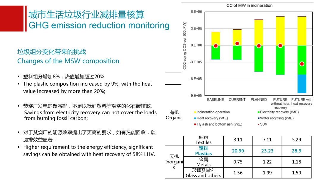 這是以蘇州為例,蘇州做的特別好,他們每年有定期大量的數(shù)據(jù)監(jiān)測,能夠證實我這個數(shù)據(jù)的科學(xué)性和可靠性??梢钥吹教K州從17年到19年它的塑料含量增加了8%,這個可能有比較多的原因。比如生活方式的改變,是不是用了更多的快遞,經(jīng)濟水平是不是更發(fā)達了,以及是不是有可能整個垃圾收運管理體系以及環(huán)保要求更高,讓更多的品類進入到我的垃圾體系里面來。但是我必須要看到整個垃圾處理,什么東西進到焚燒廠,這個是有變化的。組分雖然增加了8%,但是對熱值貢獻是20%,如果焚燒廠不作出相應(yīng)的響應(yīng),不提高能效,之后產(chǎn)生的減排效益不足以抵消新增的塑料產(chǎn)生的排放,焚燒廠需要進一步的優(yōu)化。對焚燒廠的能源效率提出更高的要求,我們初步核算一下,如果一個焚燒廠在目前我們的垃圾組分的情況下,我們現(xiàn)在五個城市的焚燒廠基本上都能夠?qū)崿F(xiàn)噸垃圾發(fā)電量400度左右,這個已經(jīng)很高了,他們的熱效率是在28%,還能夠維持比較好的狀態(tài)。但是如果我們將來熱值或者我的組分還會進一步變化,因為垃圾分類做的越來越好,肯定熱值會越來越高。我的焚燒廠的能效就要進一步提高,否則可能會從一個有很好的減排效益的設(shè)施變化成碳排放強度可能是最高的,這個很重要。對焚燒廠來講,如果他能夠?qū)崿F(xiàn)熱能回收,就像我們上面那個圖,會給出一些建議。提高發(fā)電效率很重要,但是電和熱的回收能夠?qū)崿F(xiàn)更高的能效的利用,可能就會有更好的減排效益,這也是在焚燒企業(yè)將來去做發(fā)展戰(zhàn)略的時候需要重點考慮的一個問題。