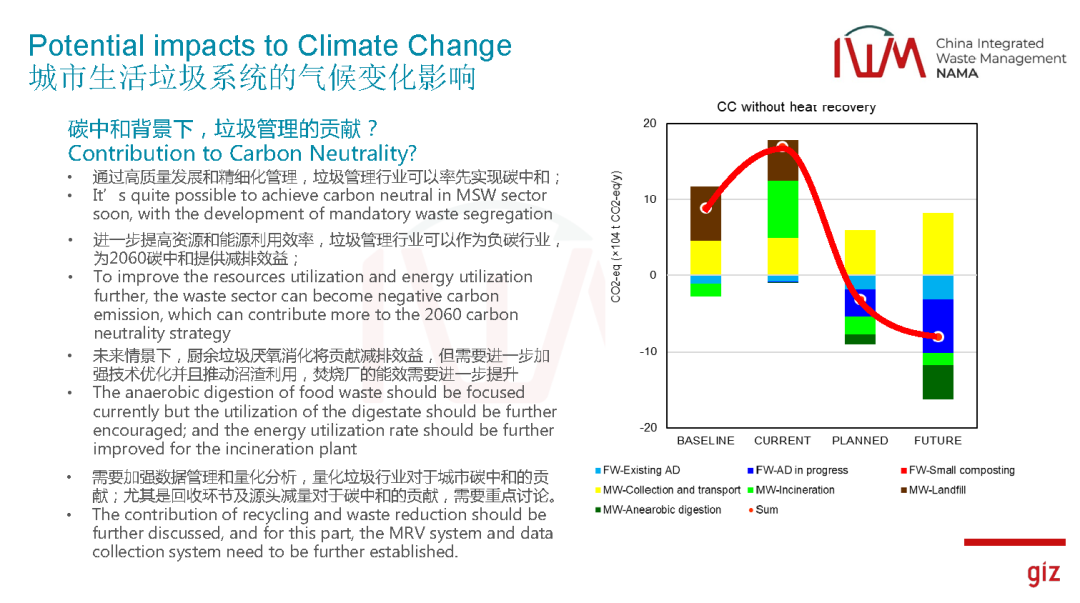 在歐盟過去的一些經(jīng)驗告訴我們,雖然垃圾行業(yè)在整個碳排放的比例不是很高,剛才王總提到3%左右。但是過去十幾年的時間證明,在垃圾行業(yè)做減排相對來說更容易、更成功。在過去十年左右,歐盟在整個垃圾管理行業(yè)貢獻了所有的溫室氣體減排量大概30%,雖然我們排放量很小,但是做減排第一有很好的協(xié)同效應(yīng),首先環(huán)境效益更好,減排效益更好,同時成本相對來說更低一些,相比碳封存這些方式,在垃圾行業(yè)做這個事情具有更好的可執(zhí)行性。