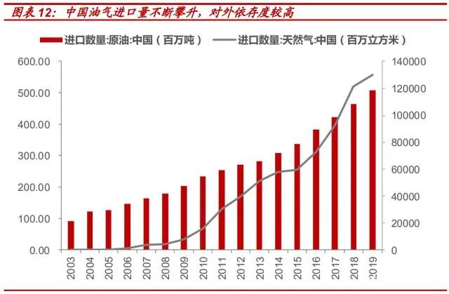 從進(jìn)口細(xì)分?jǐn)?shù)據(jù)看,石油、天然氣等能源進(jìn)口量占整體進(jìn)口量的13.28%, 僅次于芯片等關(guān)鍵技術(shù)部件,礦產(chǎn)占比達(dá)到 9%。作為我國制造業(yè)的“血 液”,近年來,我國這兩項(xiàng)進(jìn)口的需求和對(duì)外依存度呈增加趨勢(shì):2019 年,原油進(jìn)口達(dá) 5.1 億噸,增長 9.5%,對(duì)外依存度升至 72.45%,天然 氣進(jìn)口 9656 萬噸,增長 6.9%,對(duì)外依存度為 44%,油氣主要進(jìn)口國為 美俄、沙特等中東國家。根據(jù) IRENA 數(shù)據(jù),2019 年中國陸上風(fēng)電、太 陽能光伏、水電累計(jì)裝機(jī)規(guī)模分別占全球總量的 34%、35%、27%,碳 中和目標(biāo)路徑下,新舊能源結(jié)構(gòu)的轉(zhuǎn)變有助于提升中國國內(nèi)大循環(huán)下的 供給側(cè)的上游資源可控。
