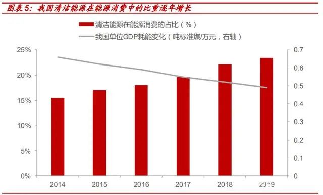 實(shí)際上,伴隨政府對(duì)新能源領(lǐng)域的研究與使用的倡導(dǎo),2014-2019 年我 國單位 GDP 能耗已經(jīng)出現(xiàn)連續(xù)下滑,我國能源利用效率逐年增長。2019 年,我國每萬元 GDP 消費(fèi) 0.49 噸標(biāo)準(zhǔn)煤,較 2018 年下降 4.84%。清 潔能源在能源消費(fèi)中的比重就增長至 23.4%,但傳統(tǒng)的煤炭、石油占比 分別為 57.7%、18.9%,仍是我國主要的能源消耗來源。