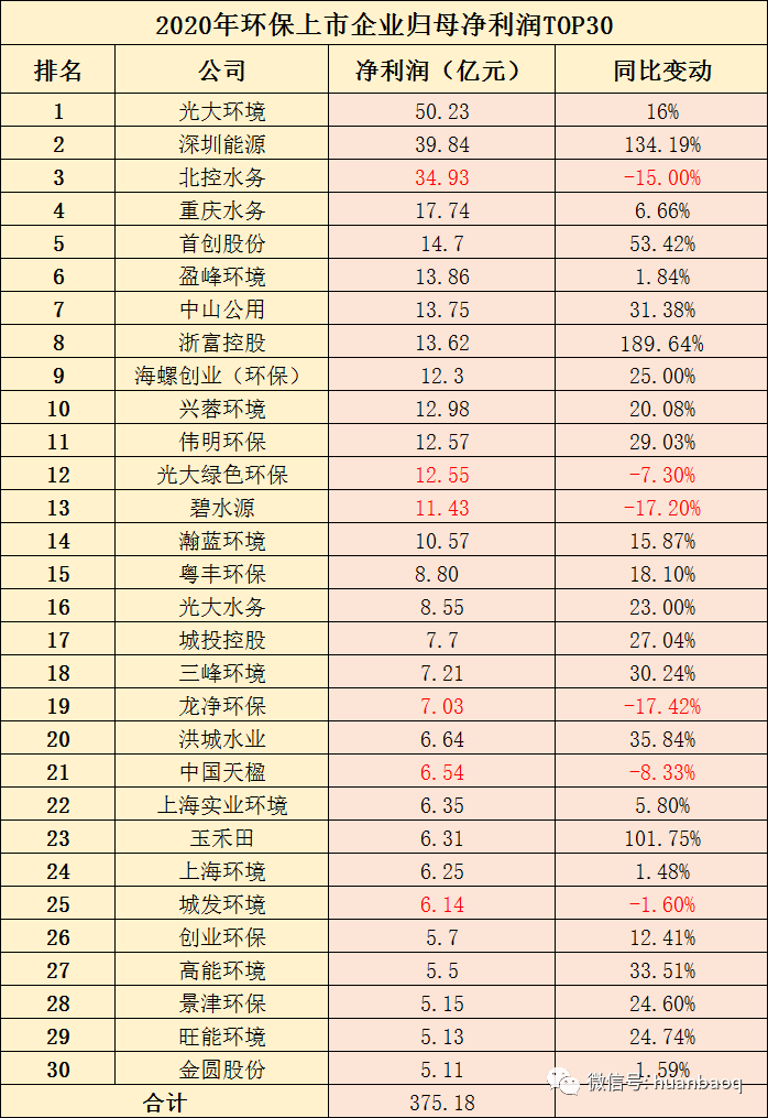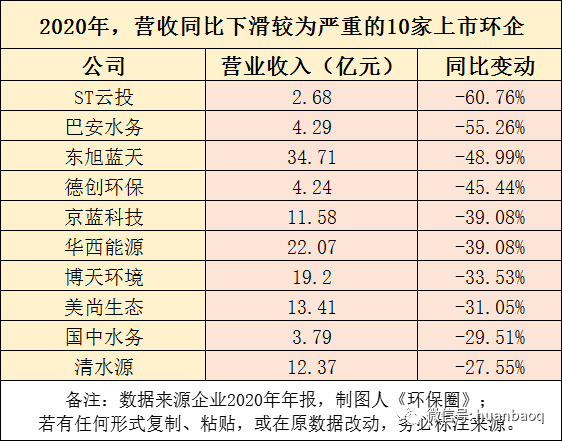 就營收增速而言,2020年,111家環(huán)保上市企業(yè)營收增速30%以上的,只有為數(shù)不多的10家。(如圖五所示)2019年這個數(shù)字還是23家,同比下降了56%。城投控股、德林海、雅居樂(環(huán)保)、城發(fā)環(huán)境、旺能環(huán)境、中環(huán)環(huán)保、高能環(huán)境、綠茵生態(tài)、三峰環(huán)境等企業(yè)都在高增長之列,而且這些企業(yè)從事業(yè)務(wù)大都與固廢相關(guān)。雅居樂不得不提。作為房企跨界入局環(huán)保的典范,旗下的環(huán)保集團,2020年面對來勢洶洶的疫情,即便身處競爭較為激烈,處理費大不如從前的危廢處置行業(yè),2020全年營收及毛利依然實現(xiàn)高速增長,值得點贊。高能環(huán)境非常優(yōu)秀,作為業(yè)內(nèi)20強為數(shù)不多上市民企,即未被產(chǎn)業(yè)寒冬和疫情的危機形勢打倒,還能從一批國資、央企中廝殺成功上位,自2014年上市以來,連續(xù)6年營收保持30%以上的增長。同樣還有低調(diào)行事的偉明環(huán)保,不僅資產(chǎn)負債率在行業(yè)內(nèi)處于較低水平(多數(shù)垃圾焚燒投資運營企業(yè)資產(chǎn)負債率60%-75%,而偉明環(huán)保今年一季度資產(chǎn)負債率只有47.5%),而且自2011年上市以來,凈利潤已由2011年的6973萬元攀升至12.57億元,歸母凈利潤連續(xù)9連增,復(fù)合增長率達到37.89%,遠高于同行水平。圖五:營收增幅30%+的10家上市環(huán)企相比上述企業(yè)的出彩表現(xiàn),接下來圖六表格中的ST云投、巴安水務(wù)、東旭藍天、華西能源、國中水務(wù)、清水源等10家上市環(huán)企的表現(xiàn)則不盡如意,2020年營業(yè)收入下滑較為嚴(yán)重,降幅最大的前三分別是ST云投、巴安水務(wù)、東旭藍天。圖六:營收同比下滑較為嚴(yán)重的10家上市環(huán)企凈利潤榜:半數(shù)位于億元以下,東方園林等增收不盈利