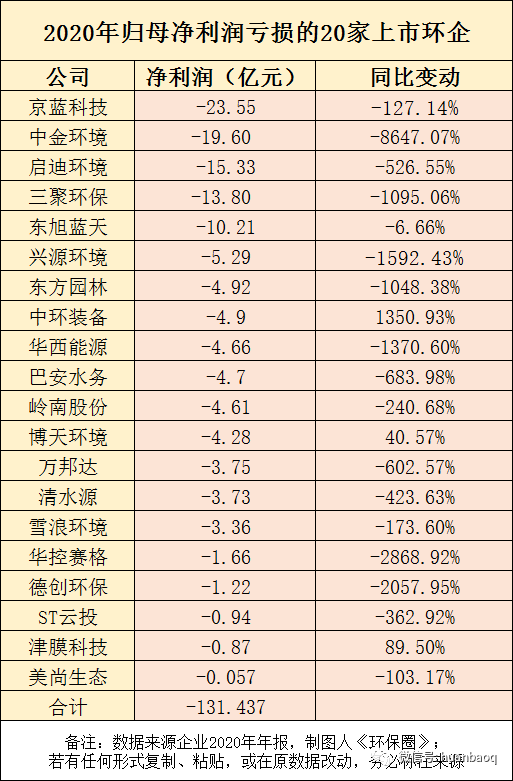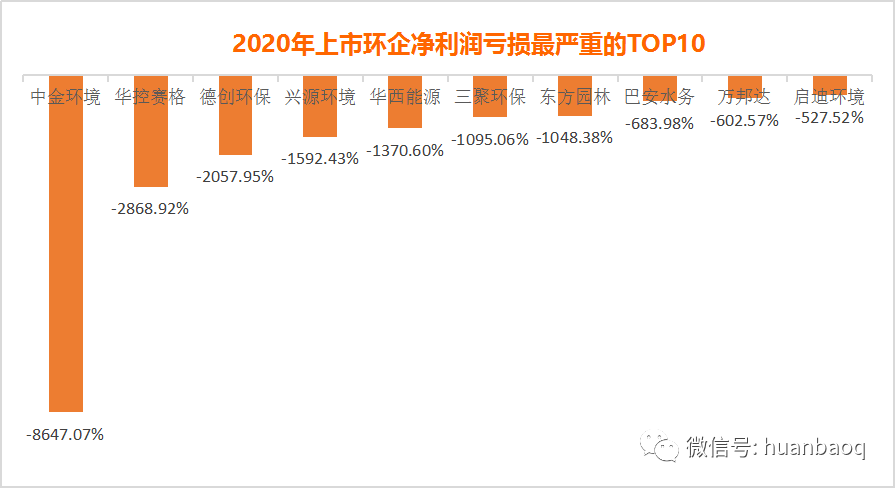 在外界宏觀條件不利、疫情生死攸關(guān)的2020年,仍有一些出類拔萃的上市環(huán)企脫穎出來,從凈利潤增速來看,2020年增速較快TOP10上市環(huán)企非常有看點(如圖八所示)。既有以買賣股權(quán)實現(xiàn)業(yè)績騰飛的聚光科技,也有前幾年負面纏身,疫情之下實現(xiàn)翻盤的中創(chuàng)環(huán)保和淪為*ST科林,還有被PPP拖累,引國資混改的蒙草生態(tài)和節(jié)能鐵漢,以及受疫情影響較小一線固廢名企,如僑銀環(huán)保、玉禾田、浙能錦江環(huán)境、玉禾田、深圳能源等。圖八:2020年環(huán)保上市企業(yè)凈利潤增速較快TOP10首先,凈利潤增幅最大當(dāng)屬聚光科技。2020年歸母凈利潤實現(xiàn)4.89億元,同比增長了1128.82%,主要原因是公司將持有的上海安譜實驗公司25.18%股權(quán),擬以3.6億元價格轉(zhuǎn)讓給廣州德福、杭州青丘。其次是被PPP拖累,遭遇生死劫的蒙草生態(tài)。據(jù)悉,蒙草生態(tài)業(yè)績實現(xiàn)大幅增長得益于旗下秦草、藏草、新草等子公司的運營良好,鞏固其核心競爭力。其中,秦草經(jīng)過激烈競標(biāo),在眾多國內(nèi)外知名企業(yè)中勝出,拿下22億元EPC總承包合同,還有子公司快樂小草的足球場建設(shè)、走路草坪等業(yè)務(wù)業(yè)發(fā)展迅猛。還有,連虧2年,終于在2020成功扭虧為盈的中創(chuàng)環(huán)保(原三維絲)也值得一提。有分析人士認為,隨著原股東“淡出”,上海中創(chuàng)控股后,雖然從經(jīng)營數(shù)據(jù)上看,已有好轉(zhuǎn)趨勢,但要消除持續(xù)多年的負面影響還需觀察。最后是受疫情影響較小,又趕上垃圾分類、市政環(huán)衛(wèi)好時候的僑銀環(huán)保。2020年營收同比增長28.87%,凈利潤大增186.03%,主要是去年疫情免收增值稅、環(huán)衛(wèi)運營項目充沛等影響。接下來,這些企業(yè)2020年經(jīng)營狀況不免有點慘淡了,真可謂旱的旱死,澇的澇死。在111家上市環(huán)企中,2020年歸母凈利潤同比下滑的有26家,虧損有20家(如圖九所示),累計虧損金額高達132億元,京藍科技、中金環(huán)境、啟迪環(huán)境、三聚環(huán)保、東旭藍天都虧損了10億元以上。可喜的是,博天環(huán)境雖然繼續(xù)虧損,但虧損幅度收窄,相較于上年同期增長了40.57%。圖九:2020年歸母凈利潤實現(xiàn)虧損的20家上市環(huán)企如果要在這20家虧損企業(yè)中,找到2020上市環(huán)企虧損幅度最大的“十大虧損王”,如圖十所示中金環(huán)境、德創(chuàng)環(huán)保、華控賽格、興源環(huán)境、三聚環(huán)保、東方園林、巴安水務(wù)、萬邦達、啟迪環(huán)境、清水源都“榜上有名”。圖十:2020上市環(huán)企虧損幅度最大的“十大虧損王”中金環(huán)境成為當(dāng)之無愧的“虧損王”,2020年凈虧損高達19.6億元,相較于2019年的2292萬元,下降了8647.07%,驚呆業(yè)界。據(jù)筆者觀察,其實從2018年中金環(huán)境就已經(jīng)開始走下坡路了。2018年,凈利潤4.3億元,比上年下滑27.17%,2019業(yè)績繼續(xù)下滑,凈利潤僅為2292萬,到了2020年,經(jīng)營更加惡化,虧損了19.6億元。巨虧原因主要受新冠肺炎疫情及市場環(huán)境影響,子公司金泰萊、中咨華宇無法完成業(yè)績承諾,面臨巨額資產(chǎn)減值問題,預(yù)計計提商譽減值金額共計17.50億元至19億元之間。同樣經(jīng)營惡化,由盈轉(zhuǎn)虧還有華控賽格、德創(chuàng)環(huán)保,這兩家企業(yè)2019年同期凈利潤分別為594萬元、625萬,到了2020年,受疫情及全球經(jīng)濟衰退的影響,環(huán)保工程業(yè)務(wù)出現(xiàn)下滑,凈利潤分別虧損約1.66億元、1.22億元,同比下降2868.92%、2057.95%。縱觀這些虧損上市環(huán)企,雖然每家企業(yè)跌倒原因不同,但年報都不約而同提及幾個方面:國內(nèi)外新冠疫情導(dǎo)致復(fù)工復(fù)產(chǎn)、項目結(jié)算周期延遲和政府支付能力下滑;環(huán)保市場競爭加劇,導(dǎo)致項目毛利減少;部分環(huán)保細分領(lǐng)域,僧多肉少,市場趨于飽和。老舊項目回款不暢,應(yīng)收賬款居高不下,導(dǎo)致壞賬減值計提損失。如東江環(huán)保年報提到,營收下滑主要系疫情影響,工業(yè)企業(yè)開工減少,導(dǎo)致危廢處理量下降;且隨著新增產(chǎn)能陸續(xù)投產(chǎn),行業(yè)競爭日趨激烈,市場收運和處理費價格有所下滑。再如中環(huán)裝備年報提到,面對傳統(tǒng)煙氣治理市場飽和,獲取大氣減排訂單變得越來越難,對公司業(yè)績造成不小的影響。無論如何,凡此過往皆為序章,最難的2020年都已過去了,面向“十四五”,所有企業(yè)都將面臨新的機遇和挑戰(zhàn)。業(yè)績好的2021年再接再厲,續(xù)寫輝煌;業(yè)績差的則要再接再厲,打個漂亮的翻身仗。未來,《環(huán)保圈》將持續(xù)關(guān)注業(yè)內(nèi)企業(yè)動態(tài),觀察行業(yè)大勢,為讀者奉獻更多精彩的分析。