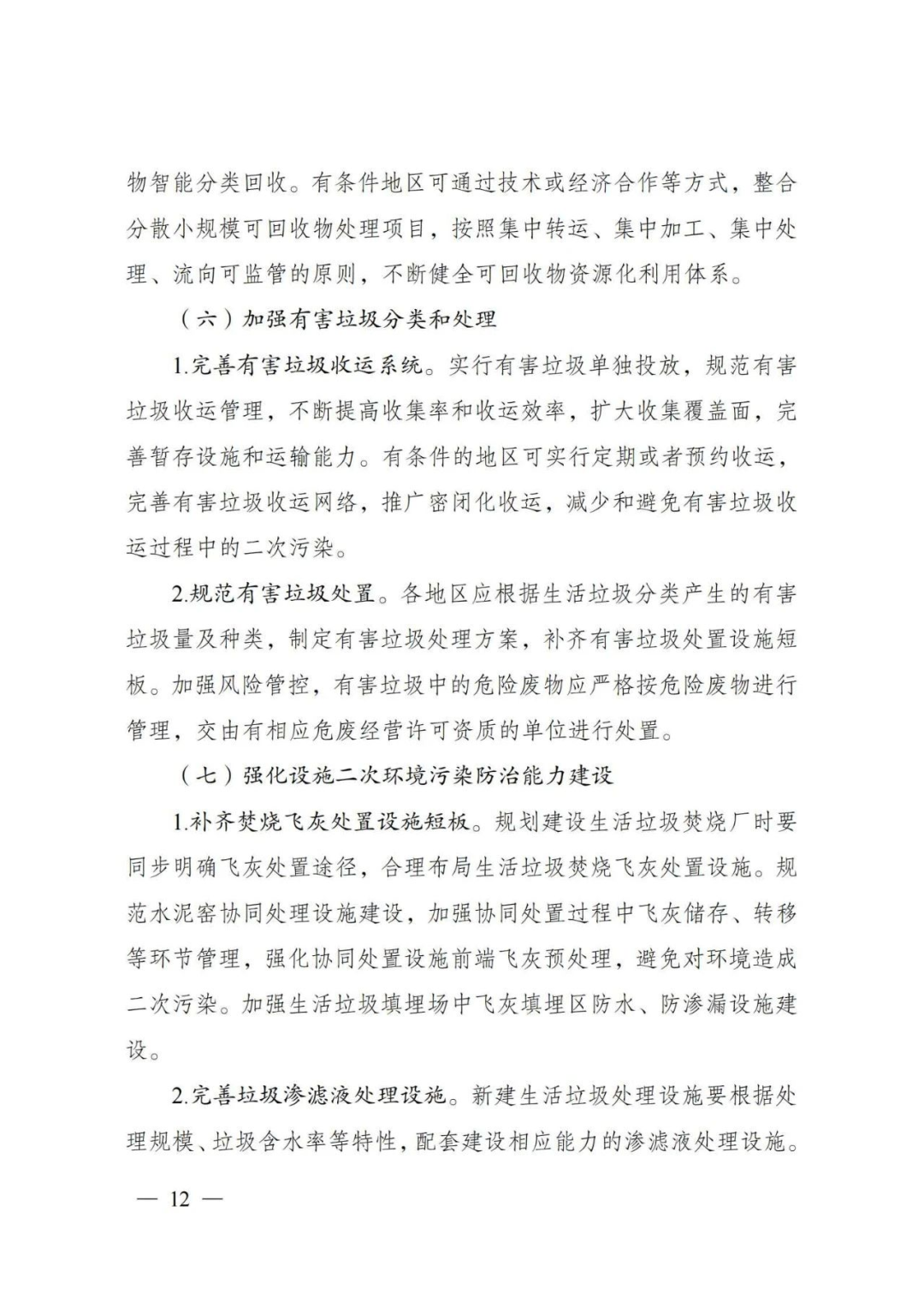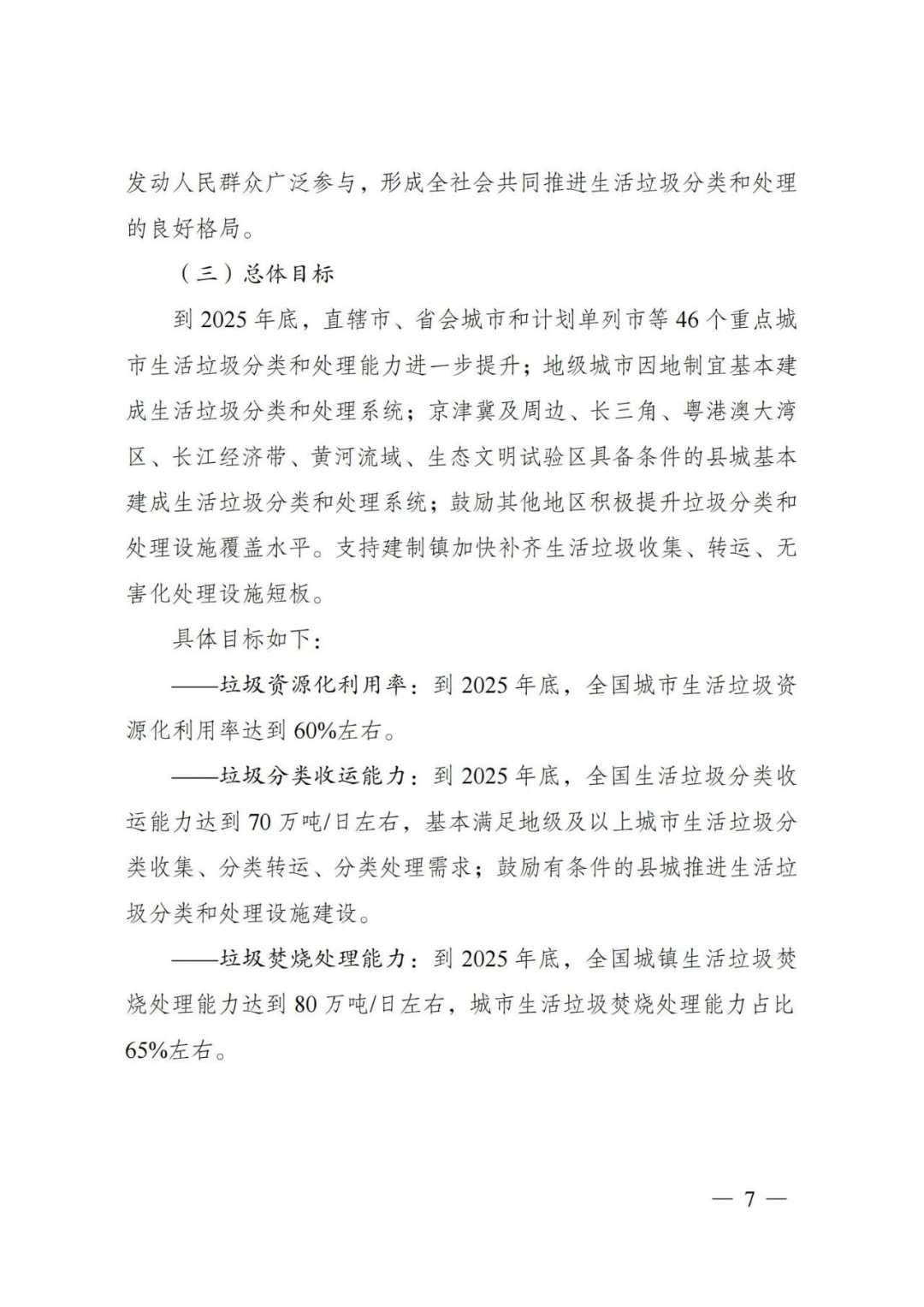 到2025年底,直轄市、省會城市和計劃單列市等46個重點城市生活垃圾分類和處理能力進(jìn)一步提升;地級城市因地制宜基本建成生活垃圾分類和處理系統(tǒng);京津冀及周邊、長三角、粵港澳大灣區(qū)、長江經(jīng)濟(jì)帶、黃河流域、生態(tài)文明試驗區(qū)具備條件的縣城基本建成生活垃圾分類和處理系統(tǒng);鼓勵其他地區(qū)積極提升垃圾分類和處理設(shè)施覆蓋水平。支持建制鎮(zhèn)加快補齊生活垃圾收集、轉(zhuǎn)運、無害化處理設(shè)施短板。
