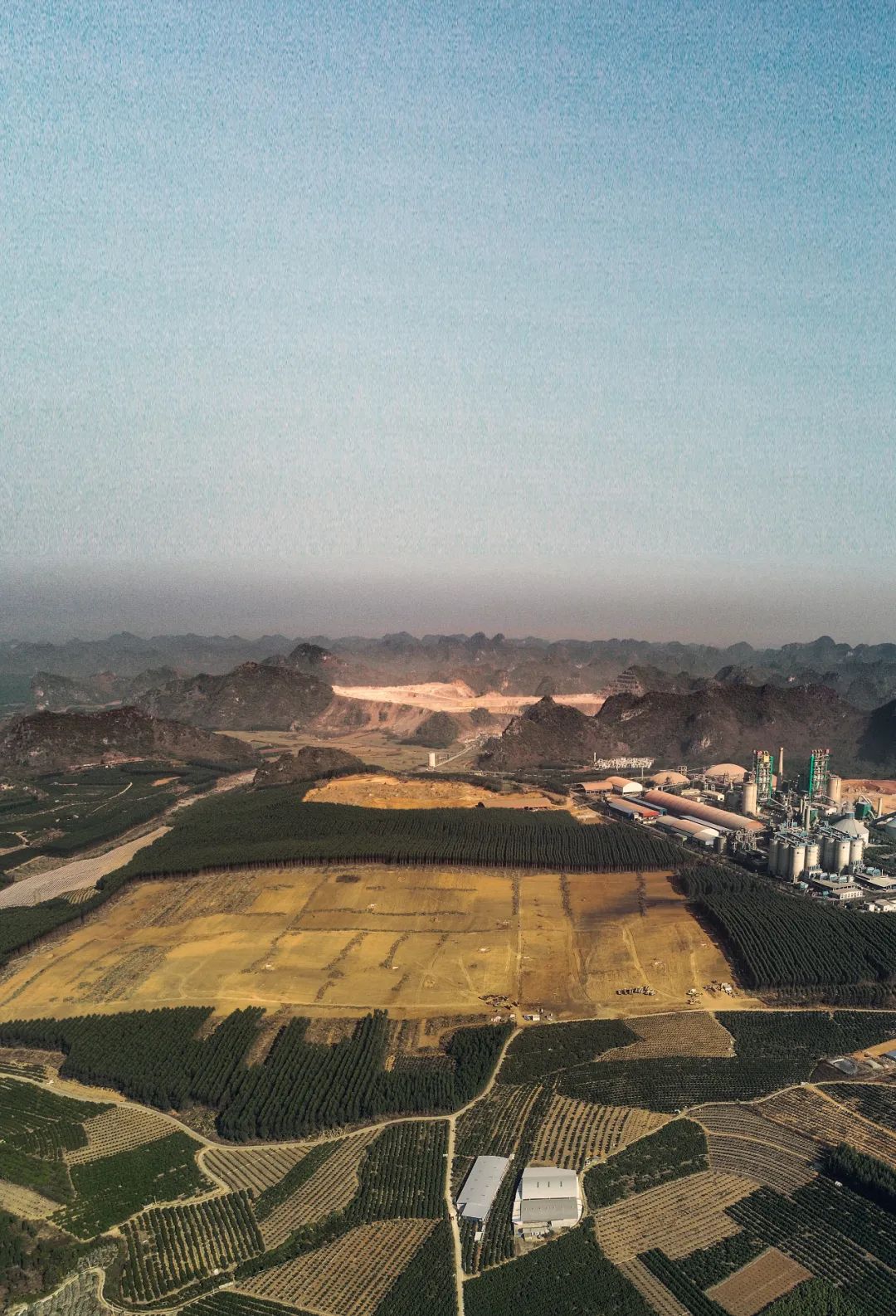 滿懷信心的設(shè)計(jì)團(tuán)隊(duì)雖然已經(jīng)看過(guò)很多廣西的資料圖片,但是到達(dá)項(xiàng)目場(chǎng)地的時(shí)候還是被大地的秀美所震撼。建設(shè)場(chǎng)地處在一片農(nóng)林用地包圍之中,臨近地塊只有一座水泥廠,而北側(cè)則是茫茫的喀斯特峰叢,一眼望不到邊際。