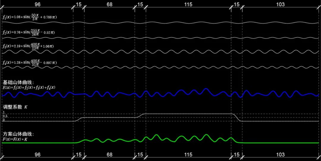 Four sets of trigonometric function curves synthesize the shape of the peak cluster. The curvature is guaranteed through function control, which provides a perfect visual appearance and detailed data support for further work.