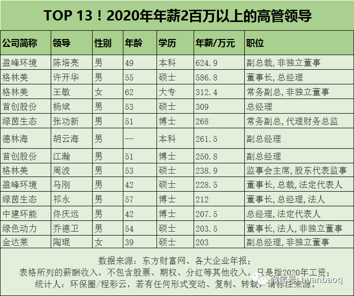 誰(shuí)是環(huán)保行業(yè)“最強(qiáng)打工人”?首先來(lái)看看整體情況,應(yīng)該說(shuō),環(huán)保企業(yè)高管的薪酬水平差距還是挺大的。總體來(lái)看,217位上市環(huán)企高管,去年年薪累計(jì)高達(dá)2.1億元,平均每人97萬(wàn)元/年,每月近9萬(wàn)元。也就是說(shuō),從平均水平上看,環(huán)保企業(yè)高管的年薪已經(jīng)達(dá)到“百萬(wàn)級(jí)”了。但事實(shí)上,每個(gè)人的情況差別非常大。最高的,可以拿到625萬(wàn)元;最低的,則只有2.4萬(wàn)元,足足相差了260倍,簡(jiǎn)直是天壤之別。為了便于觀察,我們把高管年薪分為“100萬(wàn)元以上”、“50萬(wàn)-100萬(wàn)元之間”,以及“50萬(wàn)元以下”三個(gè)檔。217位高管中,年薪收入在百萬(wàn)元以上的有71位,約占33%;年薪在50萬(wàn)元-100萬(wàn)元之間的有112位,約占52%;還有15%的企業(yè)高管,去年年薪收入在50萬(wàn)元以下,約占15%左右(如圖一所示)。圖一:217位上市環(huán)企高管薪酬收入分布也就是說(shuō),217位高管中,有1/3收入較高,在100萬(wàn)元以上;有一半收入居中,在50萬(wàn)-100萬(wàn)元之間;還有15%收入“偏低”,在50萬(wàn)元以下。如果再拔高一個(gè)級(jí)別,看一看收入兩百萬(wàn)元以上的,就只剩下為數(shù)不多的13個(gè)人了,分別供職于盈峰環(huán)境、格林美、首創(chuàng)股份、綠茵生態(tài)、中建環(huán)能、綠色動(dòng)力等8家上市環(huán)企(如圖二所示)。圖二:年薪過(guò)200萬(wàn)的13位上市環(huán)企高管其中,年薪最高的當(dāng)屬盈峰環(huán)境副總裁陳培亮,去年年薪高達(dá)625萬(wàn)元,比總裁馬剛還要高出396萬(wàn)元,可謂是環(huán)保領(lǐng)域的“最強(qiáng)打工人”。很多人或許對(duì)陳培亮還不夠了解,其實(shí)他在成為盈峰環(huán)境副總裁之前,就已經(jīng)有非常光鮮的履歷。早在10年前的2010年,38歲的他就已經(jīng)成為中聯(lián)重科的副總裁,在他的帶領(lǐng)下,中聯(lián)重科大力研發(fā)環(huán)衛(wèi)裝備制造,逐步成為環(huán)保行業(yè)的龍頭企業(yè)。正是由于其在環(huán)衛(wèi)裝備制造的杰出表現(xiàn),5年前,盈峰環(huán)境斥巨資從中聯(lián)重科購(gòu)買中聯(lián)環(huán)境(現(xiàn)盈峰中聯(lián))全部股份,而作為中聯(lián)環(huán)境曾經(jīng)的總經(jīng)理陳培亮,自然也被委以重用,給予了非常高的薪酬。從盈峰中聯(lián)的表現(xiàn)來(lái)看,應(yīng)該說(shuō),這份年薪是他應(yīng)得的。排名第二的是格林美的兩位高管——55歲的董事長(zhǎng)許開(kāi)華(587萬(wàn)元/年)和62歲的常務(wù)副總王敏(312萬(wàn)元/年)。值得一提的是,相比2019年(年薪805萬(wàn)元),許開(kāi)華在2020年的年薪已經(jīng)“自降”了218萬(wàn)元,這或許與公司去年的凈利潤(rùn)下滑有關(guān)。217位上市環(huán)企高管中,有58位,占比約1/4的高管年薪在100萬(wàn)元-200萬(wàn)元之間。其中,年薪150萬(wàn)元以上的有:中持股份副總經(jīng)理張翼飛、東江環(huán)保董事長(zhǎng)譚侃、節(jié)能國(guó)禎創(chuàng)始人李煒、東方園林董事長(zhǎng)劉偉杰、博天環(huán)境董事長(zhǎng)趙笠鈞、瀚藍(lán)環(huán)境總經(jīng)理金鐸、清新環(huán)境總裁李其林、維爾利董事長(zhǎng)李月中等。年薪在100萬(wàn)元-150萬(wàn)元之間的,多數(shù)都是成長(zhǎng)較快、發(fā)展極具潛力的新上市環(huán)企,比如去年六五環(huán)境日剛上市的三峰環(huán)境,其董事長(zhǎng)雷欽平、總經(jīng)理王小軍、副總經(jīng)理司景忠年薪都是在120萬(wàn)元-140萬(wàn)元之間。再如去年5月8日在科創(chuàng)板上市的金科環(huán)境,其董事長(zhǎng)張慧春、總經(jīng)理劉正洪和副總經(jīng)理崔紅梅年薪也都在100萬(wàn)元左右,其中張慧春和劉正洪薪資收入相同,去年年薪均為107萬(wàn)元。總的來(lái)說(shuō),以上就是環(huán)保行業(yè)收入最高的群體了。從年薪上看,收入相對(duì)更高的還是民企,比如盈峰環(huán)境、格林美、維爾利,以及“混改”之前的中持股份、國(guó)禎環(huán)保、博天環(huán)境、清新環(huán)境等等。這些企業(yè),基本也代表著環(huán)保行業(yè)的最高水準(zhǔn),企業(yè)效益更好,所以高管薪酬更高也就不足為怪了。董事長(zhǎng)年薪排行:最低的只有2.5萬(wàn)元!