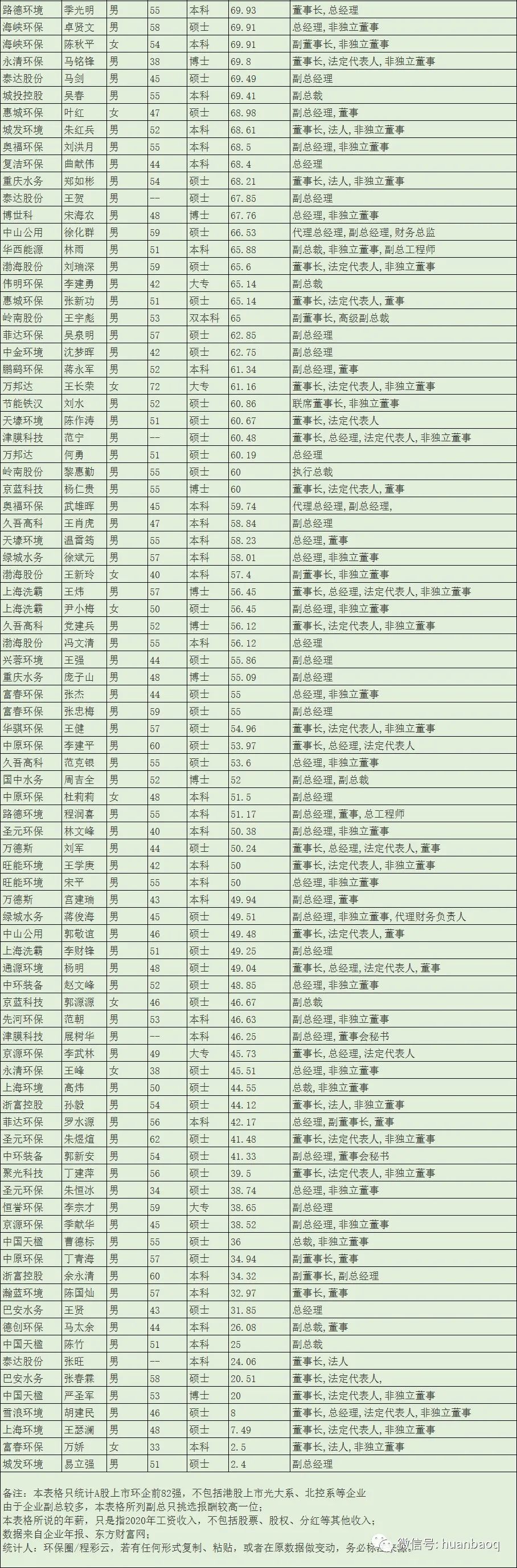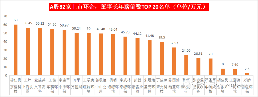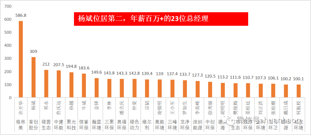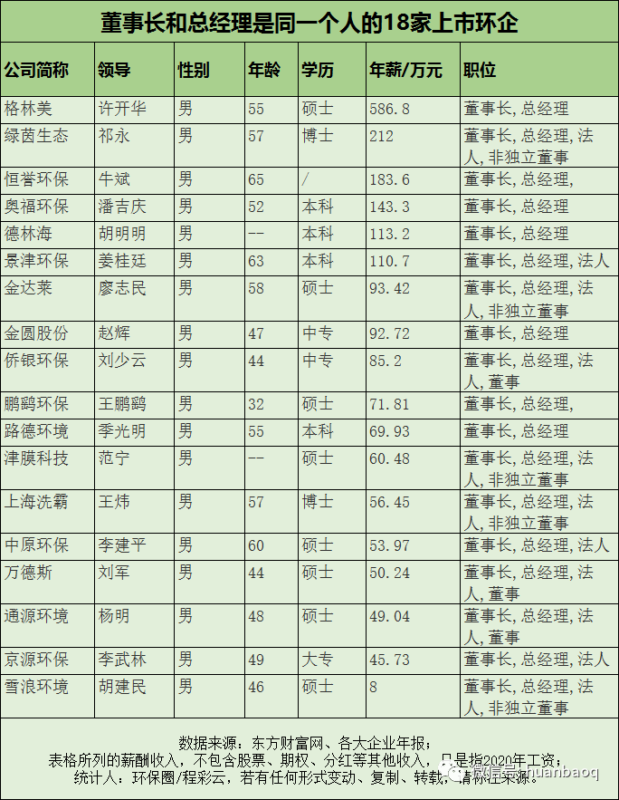 看完了整體的情況,再來(lái)看看董事長(zhǎng)這個(gè)維度的排名。在“A股上市環(huán)企董事長(zhǎng)年薪TOP20榜單”中,格林美的許開(kāi)華以587萬(wàn)元高居榜首,比第二名(盈峰環(huán)境董事長(zhǎng)馬剛)和第三名(綠茵生態(tài)祁永)的總和還要高出150萬(wàn)元。(如圖三所示)。圖三:A股82家上市環(huán)企,董事長(zhǎng)年薪排名前TOP20也有的老板不舍得為自己開(kāi)工資,在圖四“董事長(zhǎng)年薪倒數(shù)TOP20榜單”中,2020年年薪最低的董事長(zhǎng)只有2.5萬(wàn)元,月平均工資約2000元,這水平都抵不上一位普通的職員。圖四:A股82家上市環(huán)企,董事長(zhǎng)年薪倒數(shù)TOP20這位拿著2.5萬(wàn)元年薪的董事長(zhǎng),就是富春環(huán)保董事長(zhǎng)萬(wàn)嬌。公開(kāi)資料顯示,富春環(huán)保董事長(zhǎng)萬(wàn)嬌是一位1988年出生,年僅33歲的女掌門(mén)人,但其掌門(mén)的富春環(huán)保,市值則已高達(dá)56億元。眾所周知,富春環(huán)保是一家剛剛經(jīng)歷了“混改”的企業(yè),去年南昌市國(guó)資委剛剛?cè)胫?,萬(wàn)嬌則是由南昌國(guó)資提名,代替原董事長(zhǎng)的人選。事實(shí)上,在統(tǒng)計(jì)董事長(zhǎng)薪資收入時(shí),我們發(fā)現(xiàn)了一個(gè)有趣的現(xiàn)象——好多上市環(huán)企,副總、總經(jīng)理的年薪都要高于董事長(zhǎng)!甚至有的董事長(zhǎng)(如首創(chuàng)股份劉永政),都沒(méi)有在公司領(lǐng)取任何報(bào)酬!不過(guò),這些董事長(zhǎng)收入較低的企業(yè),很多還都是業(yè)績(jī)表現(xiàn)不錯(cuò)的企業(yè),比如瀚藍(lán)環(huán)境、中國(guó)天楹、上海環(huán)境、富春環(huán)保等。或許,董事長(zhǎng)情愿“讓賢”,讓更專業(yè)的人才來(lái)管理企業(yè),并給予更高的報(bào)酬,也是這些企業(yè)發(fā)展更好的原因之一吧。總經(jīng)理年薪排行:首創(chuàng)股份位居第二看完董事長(zhǎng)的,再來(lái)看總經(jīng)理的。首先,很多環(huán)保公司,董事長(zhǎng)和總經(jīng)理都是一人兼任,如格林美許開(kāi)華、僑銀環(huán)保劉少云、景津環(huán)保姜桂廷、金達(dá)萊廖志民、通源環(huán)保楊明、恒譽(yù)環(huán)保牛斌、奧福環(huán)保潘吉慶等(如圖五所示)。同時(shí),這些董事長(zhǎng)兼總經(jīng)理幾乎都是清一色的男性。年紀(jì)最大是去年科創(chuàng)板上市的恒譽(yù)環(huán)保創(chuàng)始人牛斌,今年65歲;最小的當(dāng)數(shù)“環(huán)二代”,子承父業(yè)的王鵬鷂,今年32歲。圖五:董事長(zhǎng)和總經(jīng)理是同一個(gè)人的18家上市環(huán)企從薪酬來(lái)看,在60位上市環(huán)企總經(jīng)理中,年薪達(dá)到“百萬(wàn)級(jí)”以上的有23位,約占40%(如圖六所示)。其中,有不少業(yè)內(nèi)熟知的大咖,如首創(chuàng)股份原總經(jīng)理?xiàng)畋螅晷?09萬(wàn)元)、瀚藍(lán)環(huán)境金鐸(年薪150萬(wàn)元)、高能環(huán)境凌錦明(年薪139萬(wàn)元)、三峰環(huán)境王小軍(年薪137.4萬(wàn)元),以及碧水源戴日成(年薪100萬(wàn)元)等。圖六:去年年薪百萬(wàn)+的23位總經(jīng)理總體來(lái)看,總經(jīng)理這個(gè)維度的收入狀況還是不錯(cuò)的,“百萬(wàn)級(jí)”的占比較高,很多甚至比董事長(zhǎng)年薪還要高,也體現(xiàn)了職業(yè)經(jīng)理人的價(jià)值。副總年薪排行: