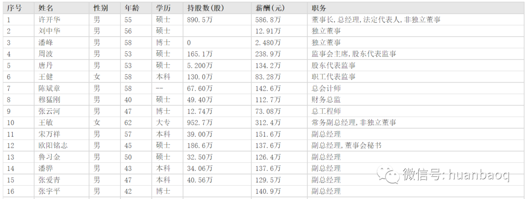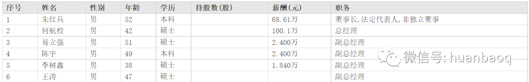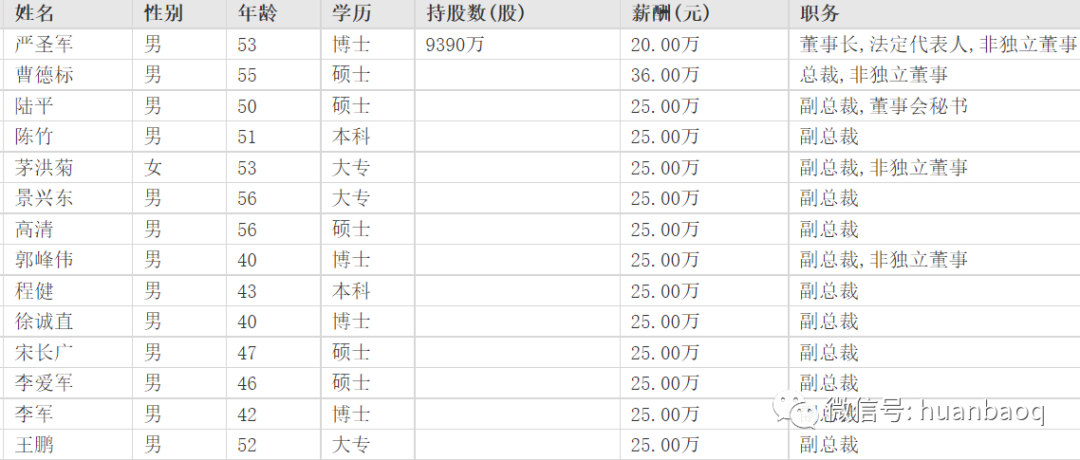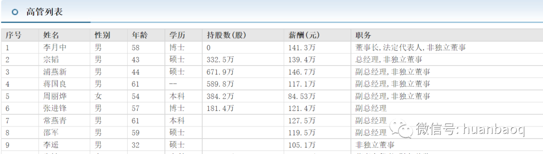 相對(duì)于董事長(zhǎng)和總經(jīng)理,副總經(jīng)理相當(dāng)于公司三把手,數(shù)量也更多??v觀每家環(huán)保上市企業(yè),副總經(jīng)理的數(shù)量雖然不盡相同,但少的也有2-3個(gè),多的則有5-6個(gè)。為了方便統(tǒng)計(jì)和比較,我們僅從各家企業(yè)中挑選報(bào)酬相對(duì)較高的一位作為代表。在我們統(tǒng)計(jì)的79位上市環(huán)企副總經(jīng)理名單中,年薪百萬(wàn)以上的有25位,約占32%;年薪50萬(wàn)元-100萬(wàn)元之間的有41位,占比52%,約占半數(shù);年薪不足50萬(wàn)元的則要13位,約占16%(如圖七所示)。這其中,盈峰環(huán)境副總裁陳培亮遙遙領(lǐng)先,年收入625萬(wàn)元;排名第二的還是格林美,其副總王敏去年薪酬312萬(wàn)元,她的另外一個(gè)身份則是格林美董事長(zhǎng)許開(kāi)華的妻子。在圖7“副總經(jīng)理薪酬TOP20榜單”中,排名靠前的企業(yè)絕大多數(shù)也都是業(yè)績(jī)表現(xiàn)好,坐落于北上廣深的大型環(huán)保上市企業(yè),如中持股份、格林美、首創(chuàng)股份、綠色動(dòng)力、清新環(huán)境等。圖七:上市環(huán)企副總經(jīng)理薪酬TOP20榜單這些企業(yè)的高管不僅百萬(wàn)年薪,很多還都大量持有公司股票,從幾十萬(wàn)股到幾百萬(wàn)股不等。以中持股份原副總朱向東為例(最近剛剛接替邵凱成為公司總經(jīng)理),按照6月10日中持股份9.93元/股的收盤(pán)價(jià),他持有132萬(wàn)股計(jì)算,他目前已是擁有1311萬(wàn)元的身價(jià)了,這還不包括每年155.4萬(wàn)元的年薪(如圖八所示)。圖八:中持股份高管團(tuán)隊(duì)收入(數(shù)據(jù)/東方財(cái)富網(wǎng))除了中持,格林美的七個(gè)副總經(jīng)理也幾乎清一色年入百萬(wàn),并大量持有公司股票(如圖九所示)。圖九:格林美高管團(tuán)隊(duì)收入(數(shù)據(jù)/東方財(cái)富網(wǎng))清新環(huán)境也不錯(cuò),總裁和四個(gè)副總的年薪,都比董事長(zhǎng)鄒艾艾要高(如圖十所示)。圖十:清新環(huán)境高管團(tuán)隊(duì)收入(數(shù)據(jù)/東方財(cái)富網(wǎng))還有首創(chuàng)股份和綠色動(dòng)力,高管團(tuán)隊(duì)年薪100萬(wàn)-300萬(wàn)不等,待遇也要高于大多數(shù)上市環(huán)企(如圖十一、圖十二所示)。圖十一:首創(chuàng)股份高管團(tuán)隊(duì)收入(數(shù)據(jù)/東方財(cái)富網(wǎng))圖十二:綠色動(dòng)力高管團(tuán)隊(duì)收入(數(shù)據(jù)/東方財(cái)富網(wǎng))在眾多環(huán)保企業(yè)中,有一家企業(yè)顯得比較“特別”,它既不坐落于北上廣深等一線大都市,去年的營(yíng)收也不是環(huán)保行業(yè)排名前20強(qiáng),但對(duì)高管團(tuán)隊(duì)卻非常“舍得”,又是年薪百萬(wàn),又是持股百萬(wàn),這家企業(yè)就是崛起于常州的維爾利集團(tuán)(如圖十三所示)。圖十三:維爾利集團(tuán)高管團(tuán)隊(duì)收入(數(shù)據(jù)/東方財(cái)富網(wǎng))從圖中可以看出,維爾利高管的年薪基本都在“百萬(wàn)級(jí)”左右,很多人持股也都在幾百萬(wàn)股以上。這樣的利益分配制度,維爾利的高管不努力,公司的業(yè)績(jī)不優(yōu)秀都太不可能了。當(dāng)然,高收入、高待遇也不只是少數(shù)環(huán)保企業(yè)的專利,絕大多數(shù)環(huán)保上市企業(yè)的高管團(tuán)隊(duì),包括總經(jīng)理和副總經(jīng)理級(jí)別的,年薪都位于50萬(wàn)元-100萬(wàn)元之間,可能還會(huì)有股票、分紅等隱性福利。眾多環(huán)保企業(yè)中,還有2家企業(yè)比較“另類”,那就是中國(guó)天楹和城發(fā)環(huán)境。在圖十四“副總經(jīng)理年薪收入后10名榜單”中,可以看到這兩家企業(yè)的副總年薪偏少。圖十四:副總經(jīng)理年薪收入后10名的名單中國(guó)天楹,創(chuàng)始人是嚴(yán)圣軍、茅洪菊夫婦,除總裁曹徳標(biāo)年薪36萬(wàn)元外,其余副總裁一律年薪25萬(wàn)元,月工資2.1萬(wàn)(如圖十五所示)。圖十五:中國(guó)天楹高管團(tuán)隊(duì)收入(數(shù)據(jù)/東方財(cái)富網(wǎng))城發(fā)環(huán)境,剛剛花了12.6億元并購(gòu)啟迪環(huán)境資產(chǎn),除總經(jīng)理年入100萬(wàn)元以外,其余三位副總年薪都低至2.4萬(wàn)元,月工資只有2000元,著實(shí)令人費(fèi)解(如圖十六所示)。圖十六:城發(fā)環(huán)境高管團(tuán)隊(duì)收入(數(shù)據(jù)/東方財(cái)富網(wǎng))這里面的原因,外部人可能很難知道,或許是有其特殊的隱情吧。全部看下來(lái),大家對(duì)于環(huán)保行業(yè)高管的收入應(yīng)該有一個(gè)大概的了解了。