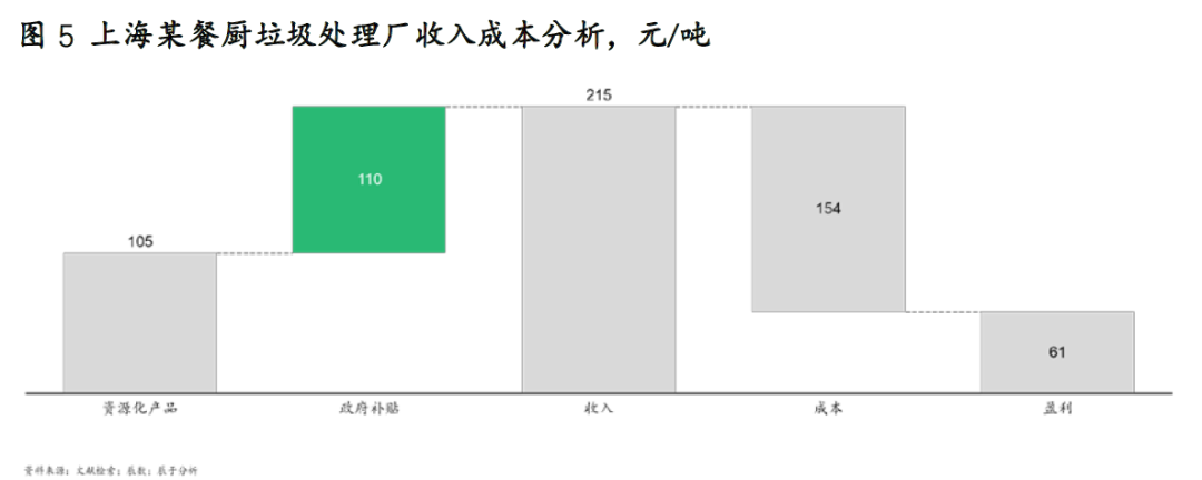 由于沼氣、粗油脂等資源化產(chǎn)物產(chǎn)量少、應(yīng)用有限,在當(dāng)前技術(shù)工藝下,餐廚垃圾處理的資源化價(jià)值很難獲得規(guī)模性與經(jīng)濟(jì)性,商業(yè)模式尚未完全走順暢。目前我國(guó)政府對(duì)餐廚垃圾企業(yè)實(shí)行運(yùn)行補(bǔ)貼和收運(yùn)補(bǔ)貼,具體金額大小受技術(shù)、地區(qū)、試點(diǎn)發(fā)展過(guò)程、項(xiàng)目處理量等因素影響。調(diào)研發(fā)現(xiàn),由于資源化產(chǎn)品盈利有限,難以覆蓋全部成本,餐廚垃圾處理企業(yè)的盈利當(dāng)前主要依靠政府補(bǔ)貼(見(jiàn)圖5)。