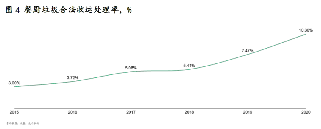 由于以上原因,我國(guó)餐廚垃圾回收并不完全。據(jù)統(tǒng)計(jì),盡管餐廚垃圾合法收運(yùn)處理率近5年持續(xù)上升,但目前也僅為10%左右(見(jiàn)圖4)。