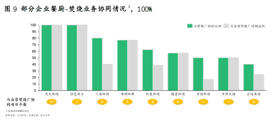 在垃圾分類(lèi)全面推行的大背景下,這些大型固廢企業(yè)正利用協(xié)同優(yōu)勢(shì)降維打擊(見(jiàn)圖9)。一方面,垃圾焚燒主業(yè)帶給這些企業(yè)資金和政府資源雙重優(yōu)勢(shì);另一方面,協(xié)同處置帶來(lái)降本增效,可以幫助這些企業(yè)降低財(cái)務(wù)壓力:在收入端,協(xié)同優(yōu)勢(shì)在于餐廚沼渣余電上網(wǎng);而在成本端,除可節(jié)約土建、人工等成本外,干濕垃圾處置的發(fā)電設(shè)備、除臭系統(tǒng)、滲濾液處理系統(tǒng)、蒸汽供熱系統(tǒng)等也可共用,從而降低折舊攤銷(xiāo)成本。