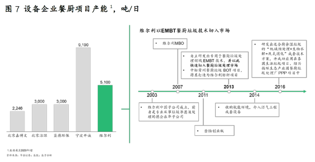展望“十四五”,我們認(rèn)為有兩股力量不容忽視,餐廚垃圾處理行業(yè)真正激烈的市場(chǎng)競(jìng)爭(zhēng)也許才剛剛開(kāi)始,一方是以寧波開(kāi)誠(chéng)、維爾利為代表的企業(yè),他們進(jìn)入市場(chǎng)較早,主要提供技術(shù)或設(shè)備,同時(shí)具有一定的產(chǎn)能規(guī)模和先發(fā)品牌優(yōu)勢(shì)(見(jiàn)圖7)。