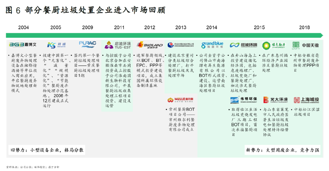 回顧我國(guó)餐廚垃圾處理行業(yè)的發(fā)展歷程,可以看到過(guò)去十幾年由于市場(chǎng)規(guī)模小、發(fā)展慢,并未引起足夠重視,主要是一些小型設(shè)備企業(yè)“小打小鬧”,市場(chǎng)比較分散,競(jìng)爭(zhēng)并不激烈。不過(guò)近幾年,隨著垃圾分類(lèi)帶來(lái)的需求激增,包括光大環(huán)境、中國(guó)天楹、上海城投等大型固廢企業(yè)紛紛進(jìn)入,硝煙四起(見(jiàn)圖6)。